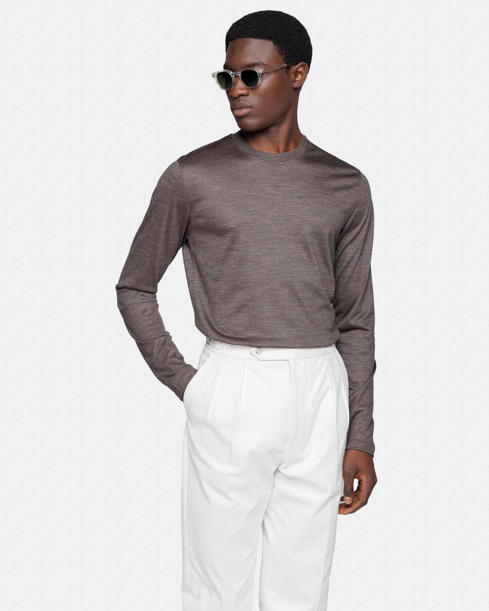 Discover our collection of made-to-measure long-sleeved T-shirts, crafted from soft, luxurious, and ultra-fine Egyptian Makò Filoscozia® cotton 80/2, one of the most precious in the world. Also available in ultra-fine Supima® cotton, with an extraordinary fineness of 120/2, in exclusive silk-cotton jersey 2/115,000, or in rare 100% European Flax linen jersey 1/26,000.