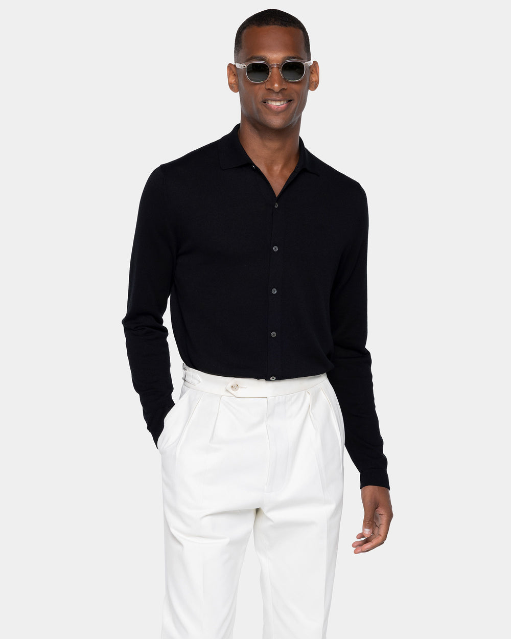 Tailor-made long-sleeved black-colored shirt with french-cut collar and grey mother-of-pearl buttons, made from a luxurious, shiny, and soft combination of ultra-fine organic cotton and Mulberry silk, the rarest in the world, in a custom-knitted single-thread fabric with a gauge of 1/30,000. The shirt is finished with 4 cm tubular cuffs and hem.