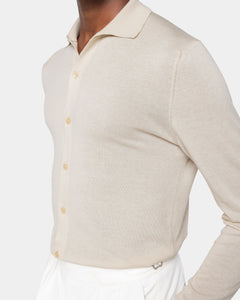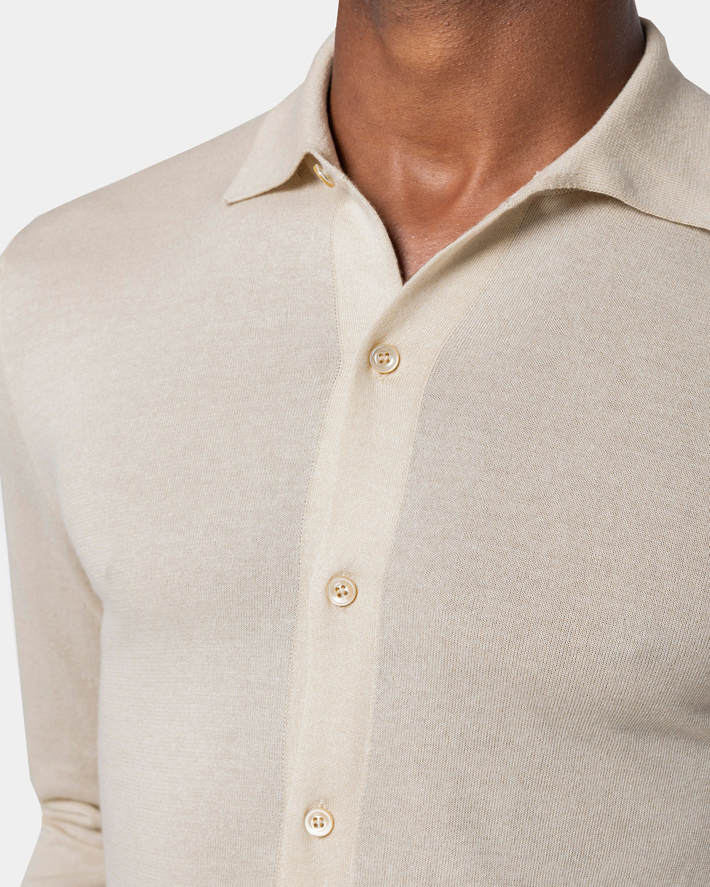 Tailor-made long-sleeved sand-colored shirt with french-cut collar and natural mother-of-pearl buttons, made from a luxurious, shiny, and soft combination of ultra-fine organic cotton and Mulberry silk, the rarest in the world, in a custom-knitted single-thread fabric with a gauge of 1/30,000. The shirt is finished with 4 cm tubular cuffs and hem.