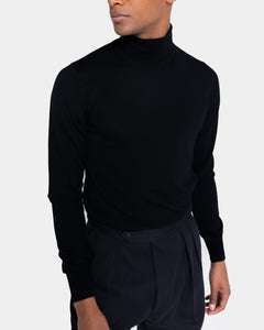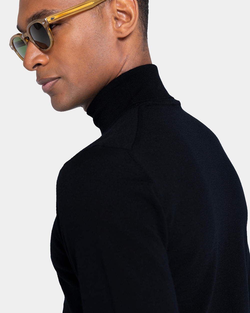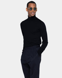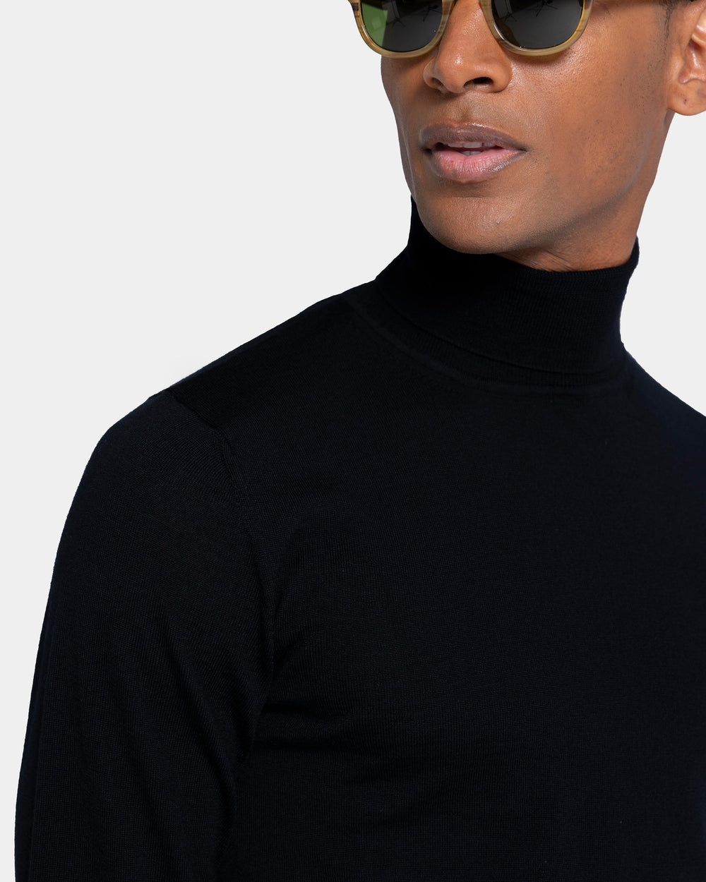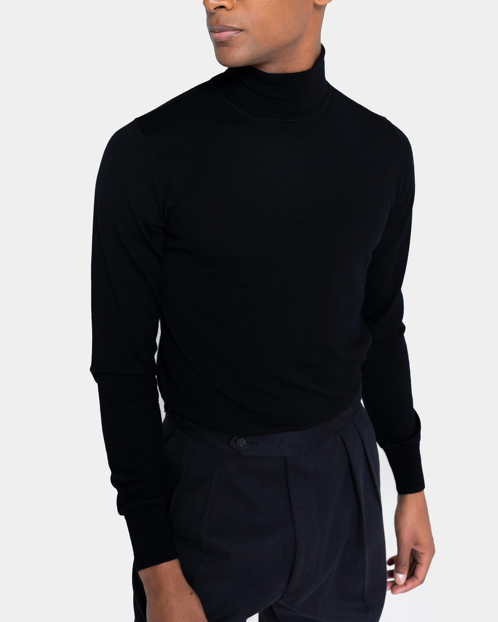 Black long-sleeved turtleneck knitwear with an ultra-fine 2/48 gauge knit made from luxurious, shiny, and soft Cashwool® yarn, 100% extra-fine Australian merino wool, the world's most prized.