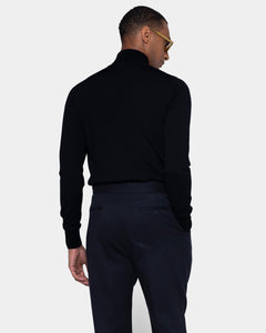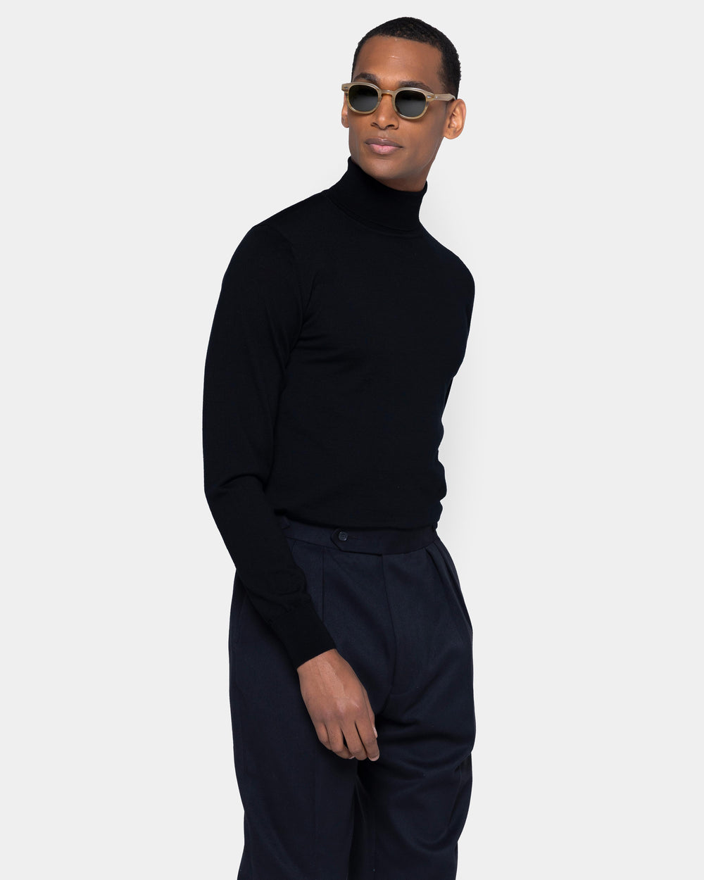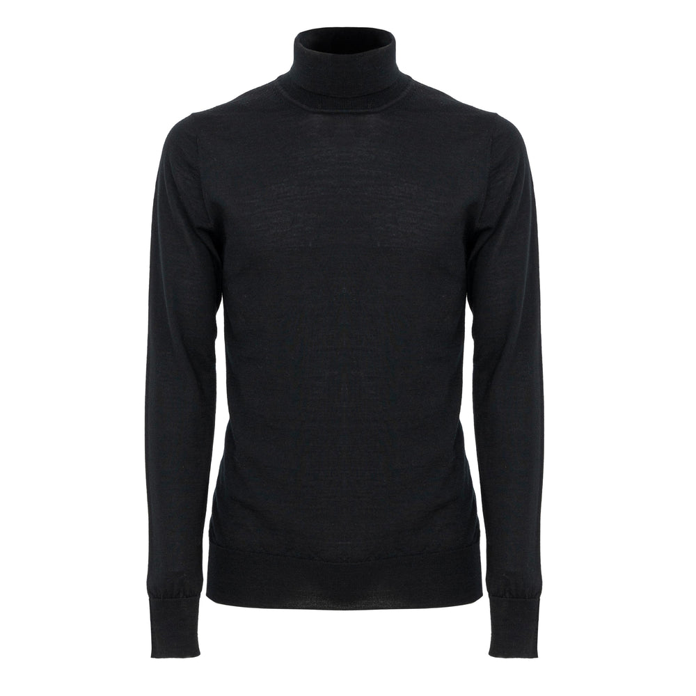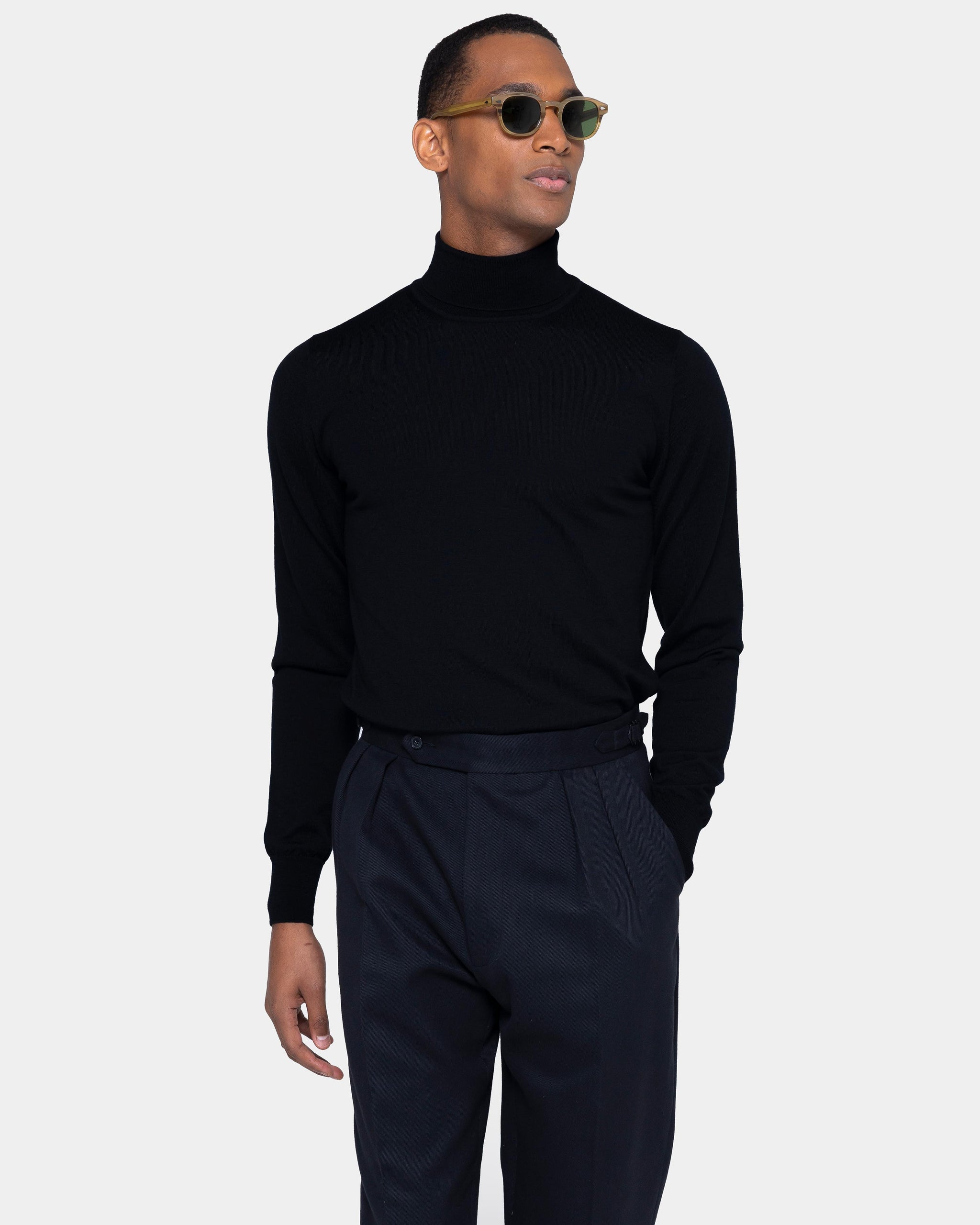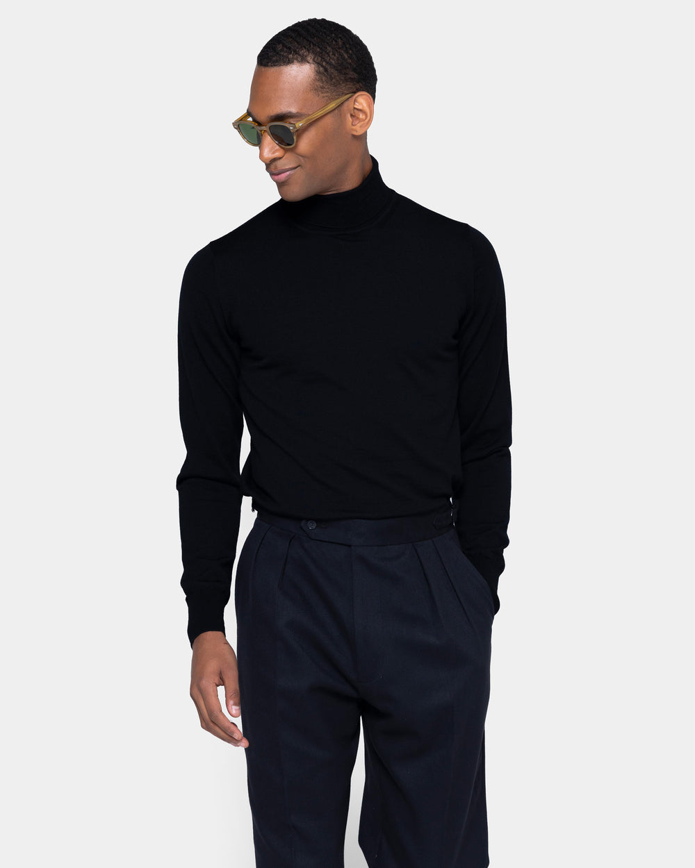 Black long-sleeved turtleneck knitwear with an ultra-fine 2/48 gauge knit made from luxurious, shiny, and soft Cashwool® yarn, 100% extra-fine Australian merino wool, the world's most prized.