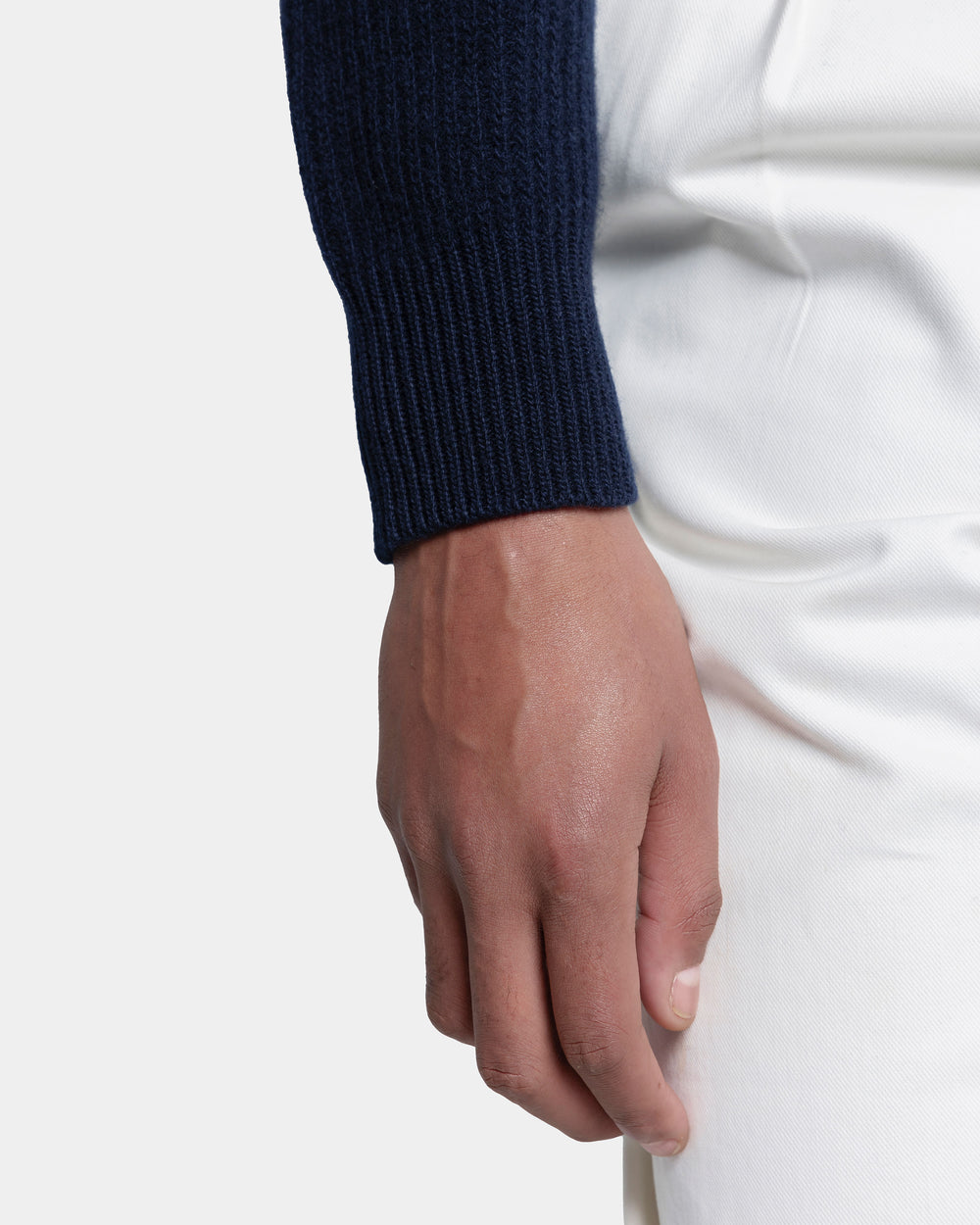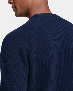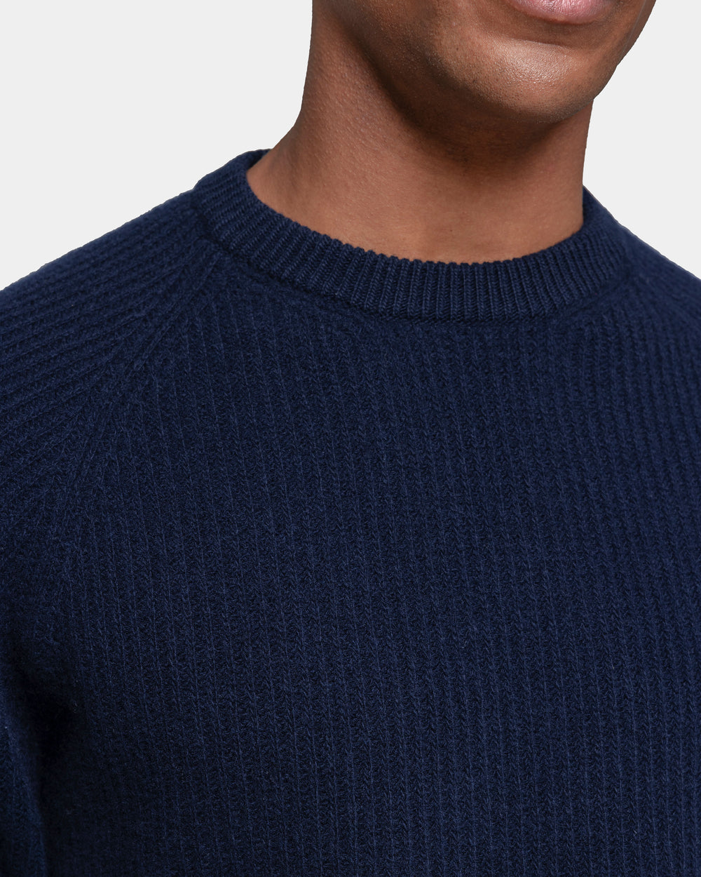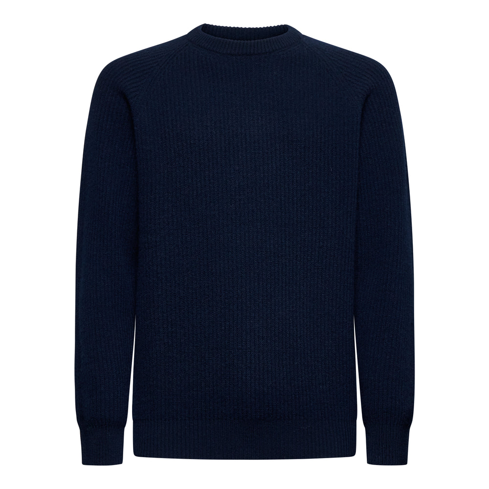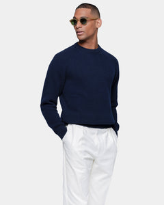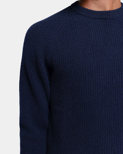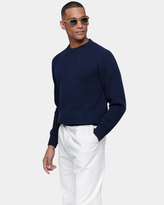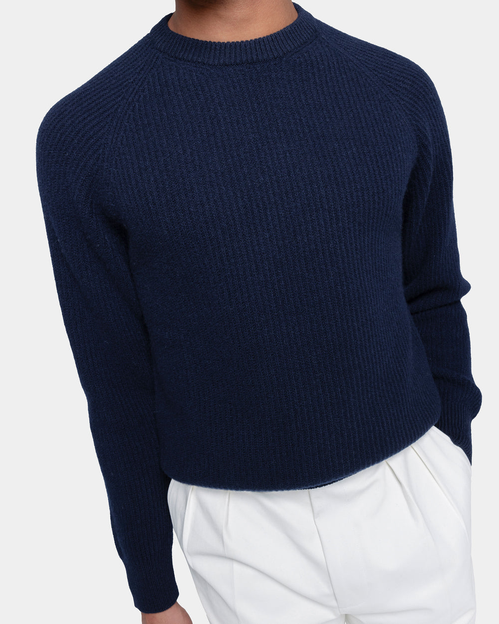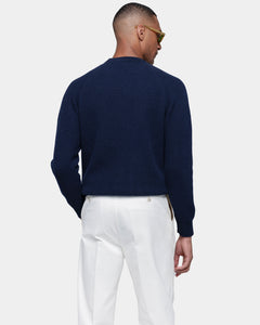 Crewneck knitwear in 2-ply superfine yarn, 1/15 NM, long sleeves, solid blue, made with luxurious Super 100's Carded Wool, a premium wool fiber known for its softness and warmth. The carded wool, subjected to the traditional carding process, gives the yarn a voluminous, soft texture and unique thermal properties, thanks to the microscopic air bubbles trapped between the fibers.