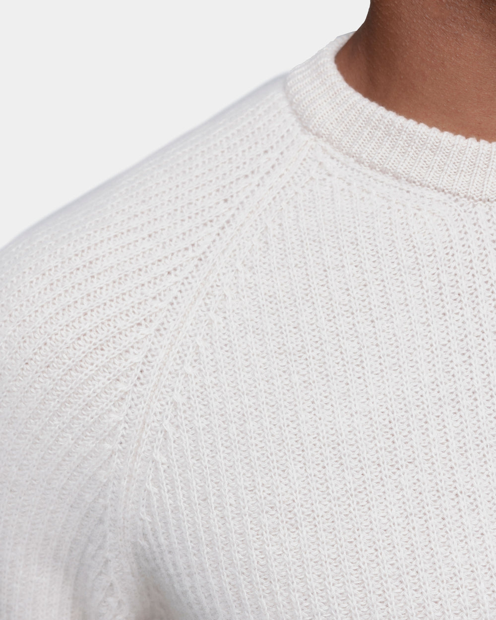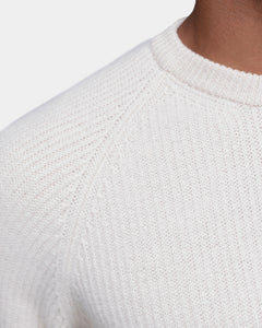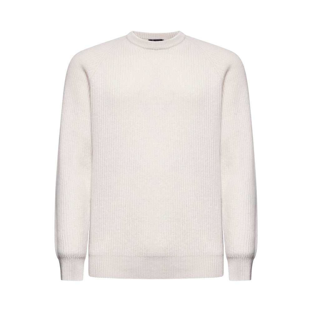 Crewneck knitwear in 2-ply superfine yarn, 1/15 NM, long sleeves, solid meringue, made with luxurious Super 100's Carded Wool, a premium wool fiber known for its softness and warmth. The carded wool, subjected to the traditional carding process, gives the yarn a voluminous, soft texture and unique thermal properties, thanks to the microscopic air bubbles trapped between the fibers.