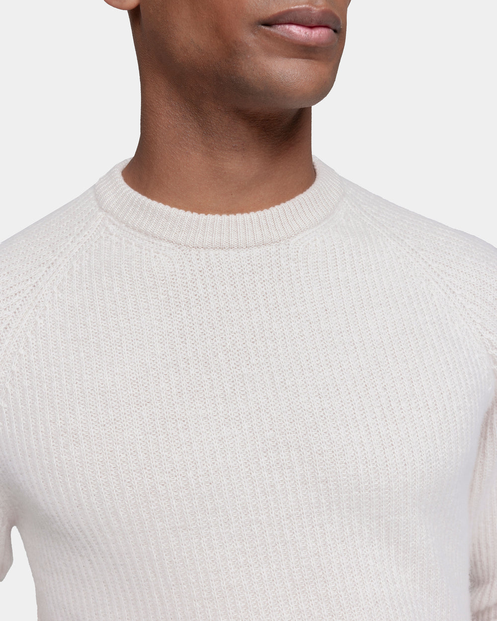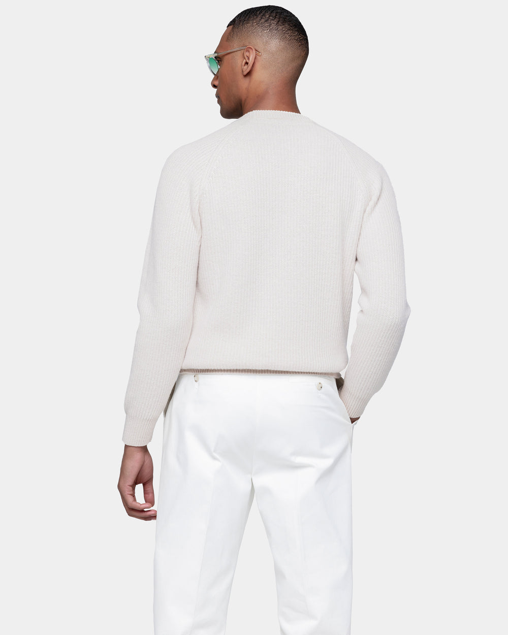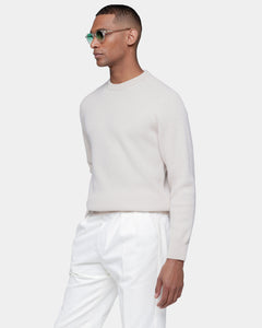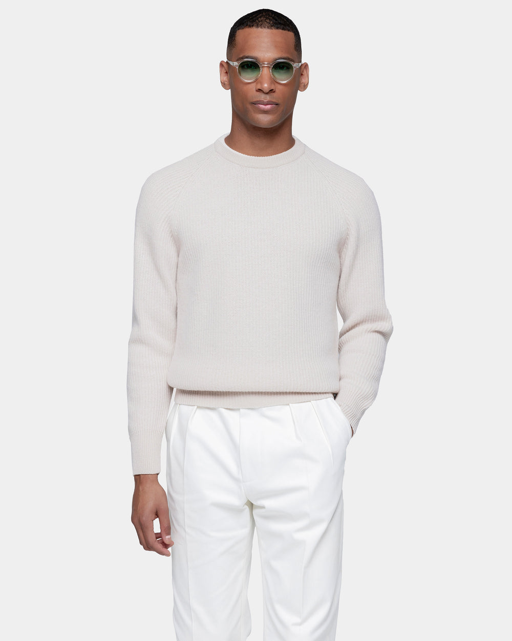 Crewneck knitwear in 2-ply superfine yarn, 1/15 NM, long sleeves, solid meringue, made with luxurious Super 100's Carded Wool, a premium wool fiber known for its softness and warmth. The carded wool, subjected to the traditional carding process, gives the yarn a voluminous, soft texture and unique thermal properties, thanks to the microscopic air bubbles trapped between the fibers.