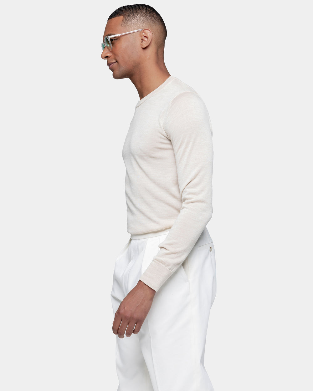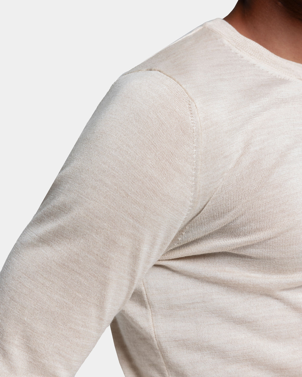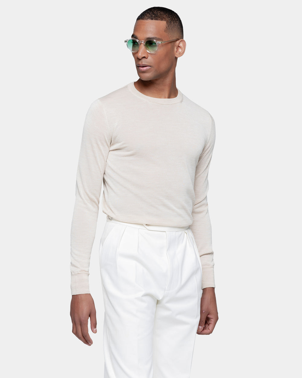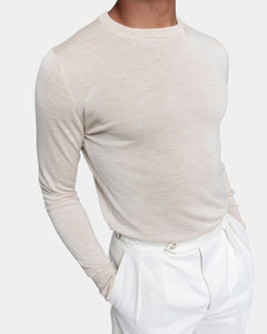 Tailor-made long sleeved crewneck knitwear in Extrafine 2/48 Gauge Yarn, Solid Beige. Crafted from a luxurious, bright, and soft blend of 70% Extrafine Merino Wool and 30% Silk of exceptional quality.
