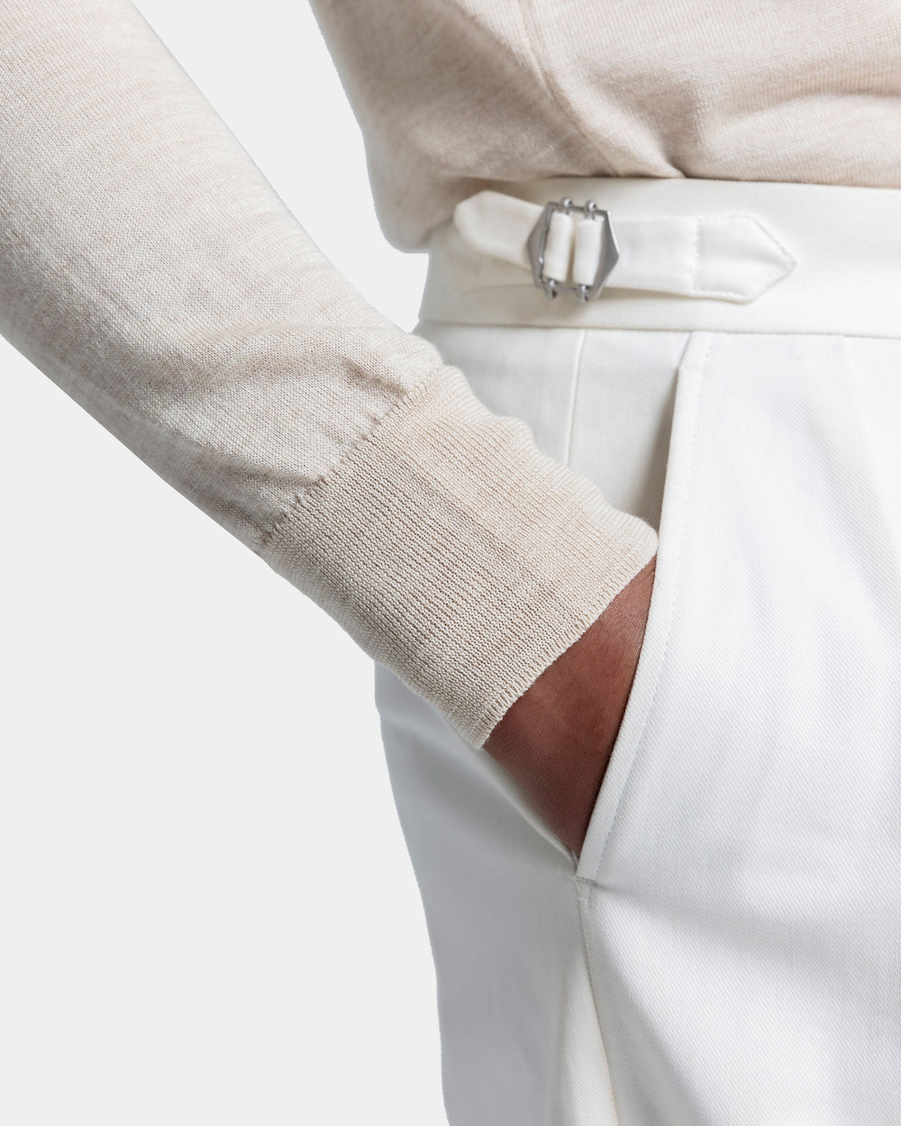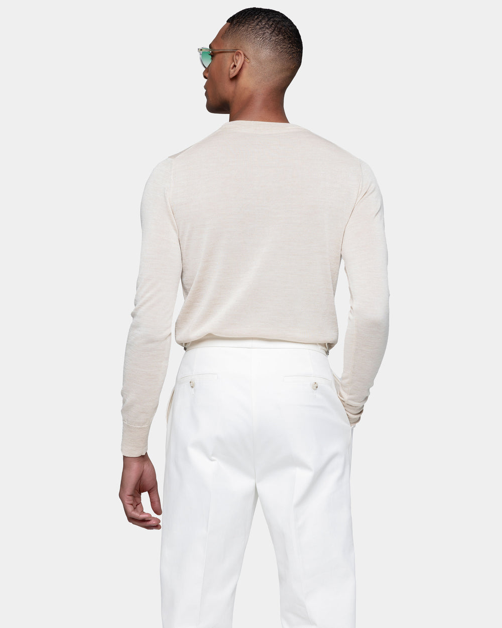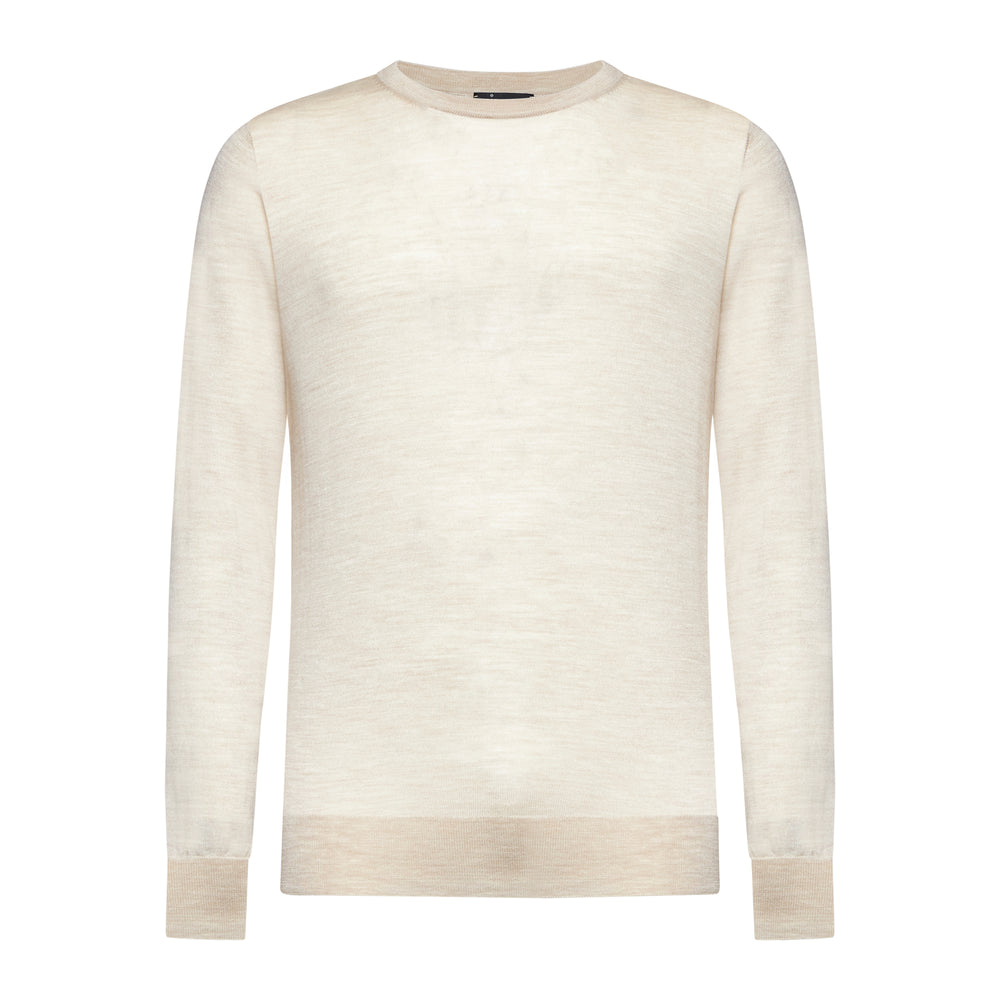 Tailor-made long sleeved crewneck knitwear in Extrafine 2/48 Gauge Yarn, Solid Beige. Crafted from a luxurious, bright, and soft blend of 70% Extrafine Merino Wool and 30% Silk of exceptional quality.