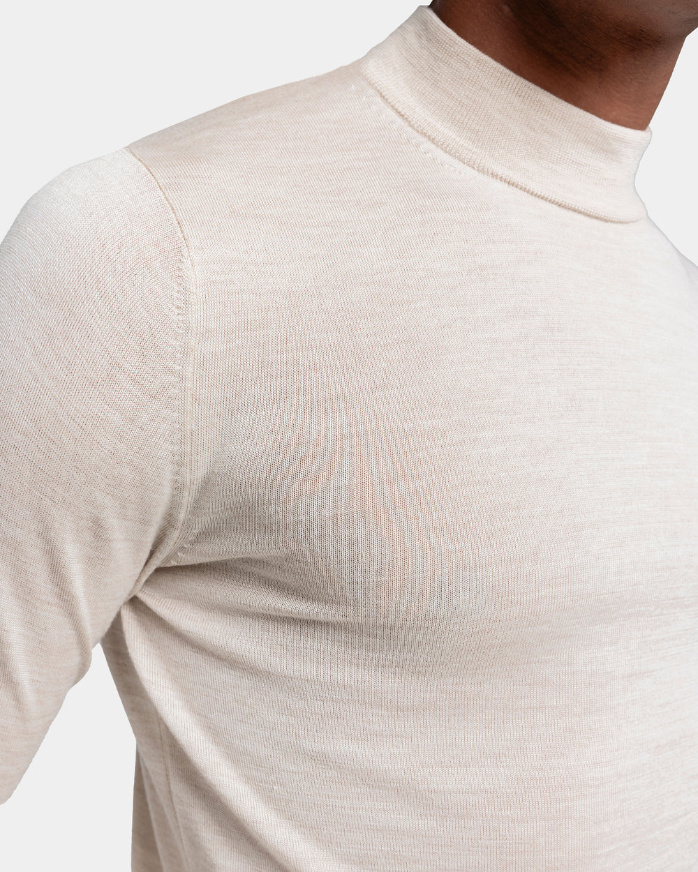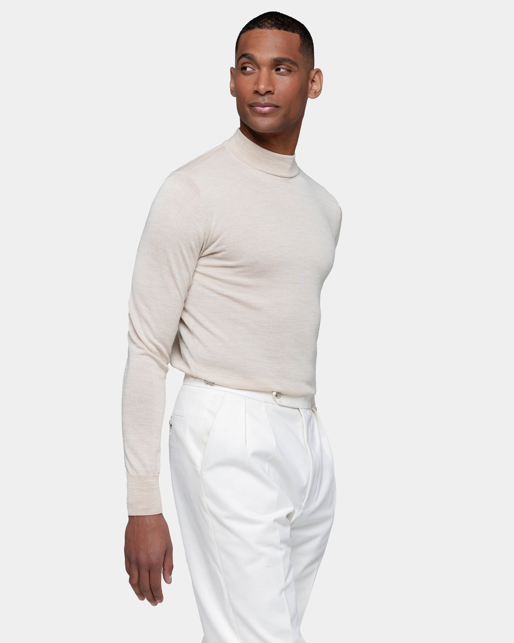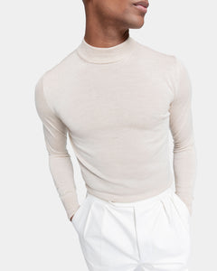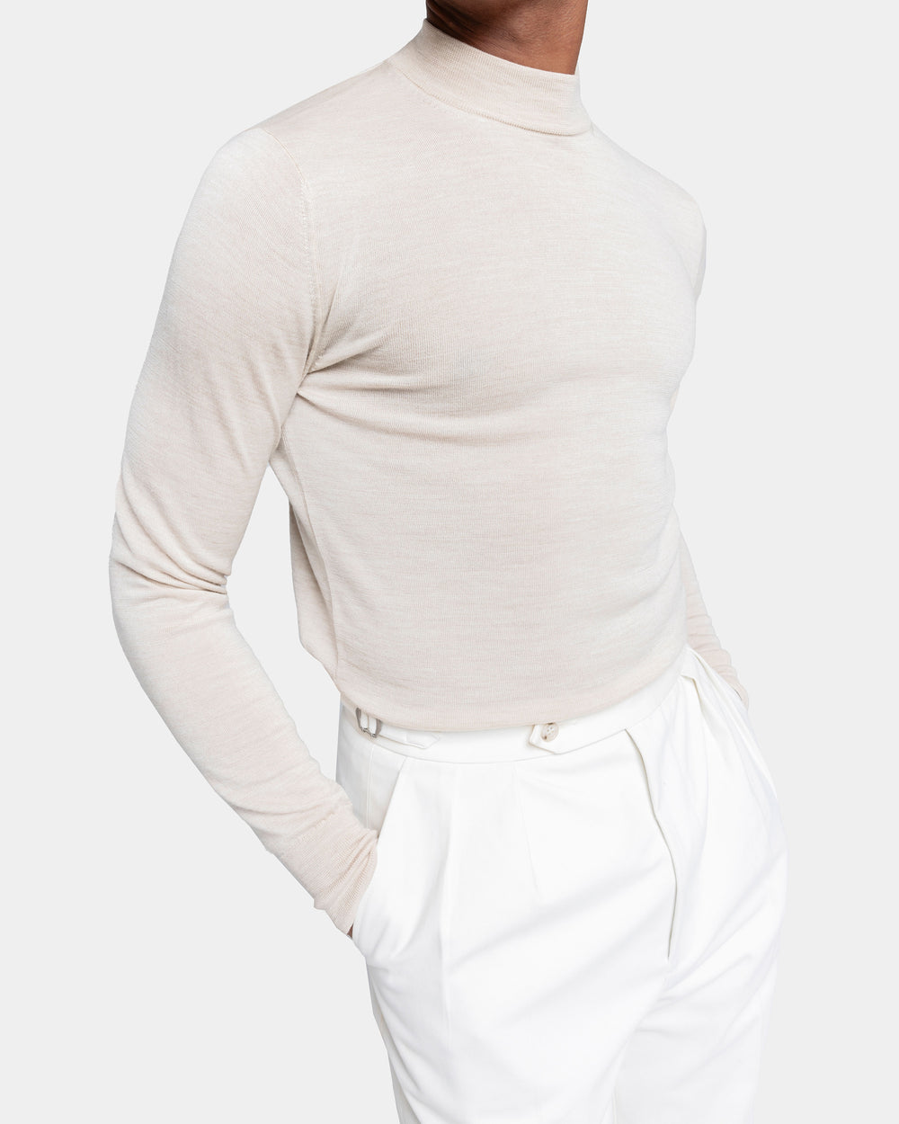 Tailor-made long sleeved highneck knitwear in Extrafine 2/48 Gauge Yarn, Solid Beige. Crafted from a luxurious, bright, and soft blend of 70% Extrafine Merino Wool and 30% Silk of exceptional quality.