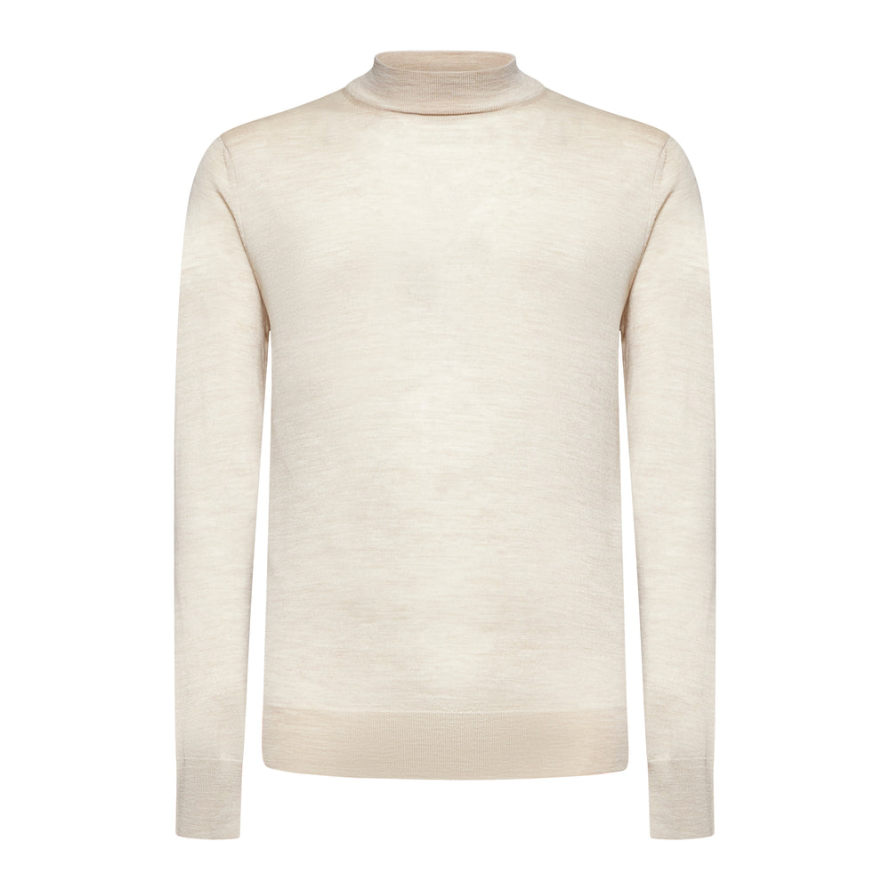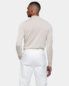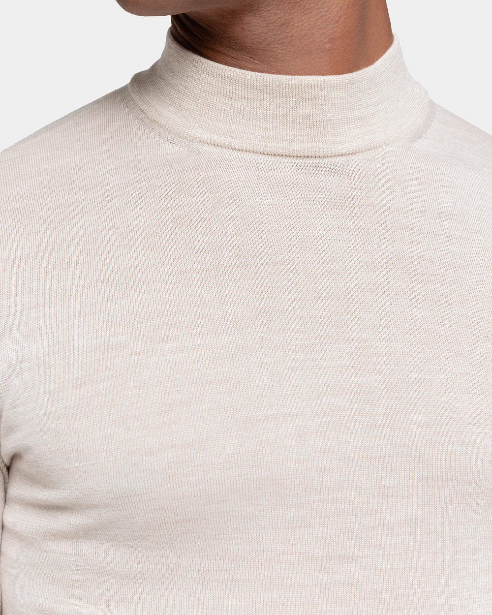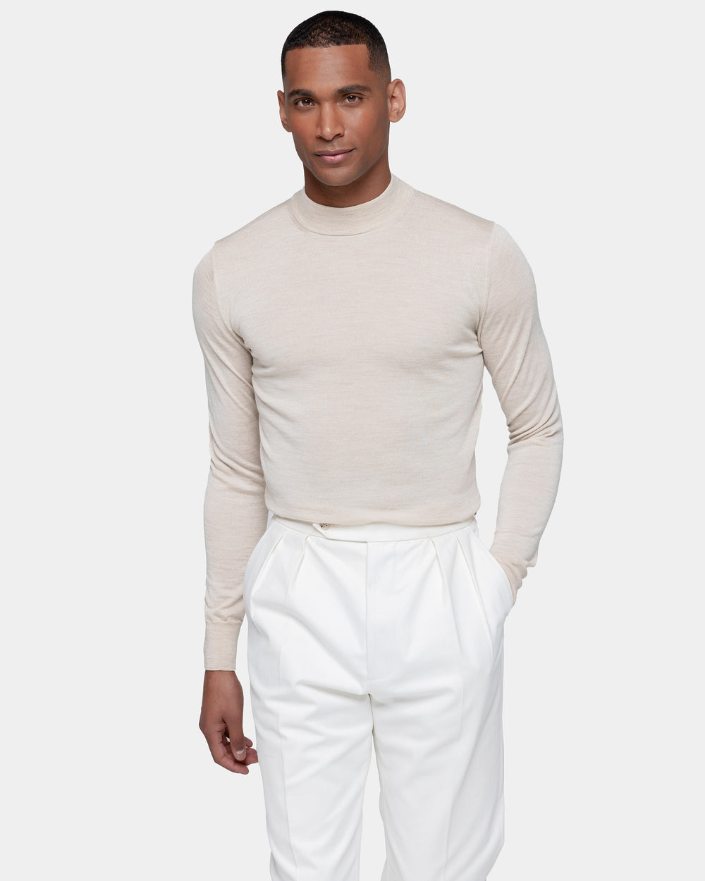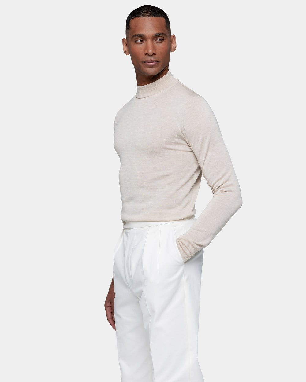 Tailor-made long sleeved highneck knitwear in Extrafine 2/48 Gauge Yarn, Solid Beige. Crafted from a luxurious, bright, and soft blend of 70% Extrafine Merino Wool and 30% Silk of exceptional quality.