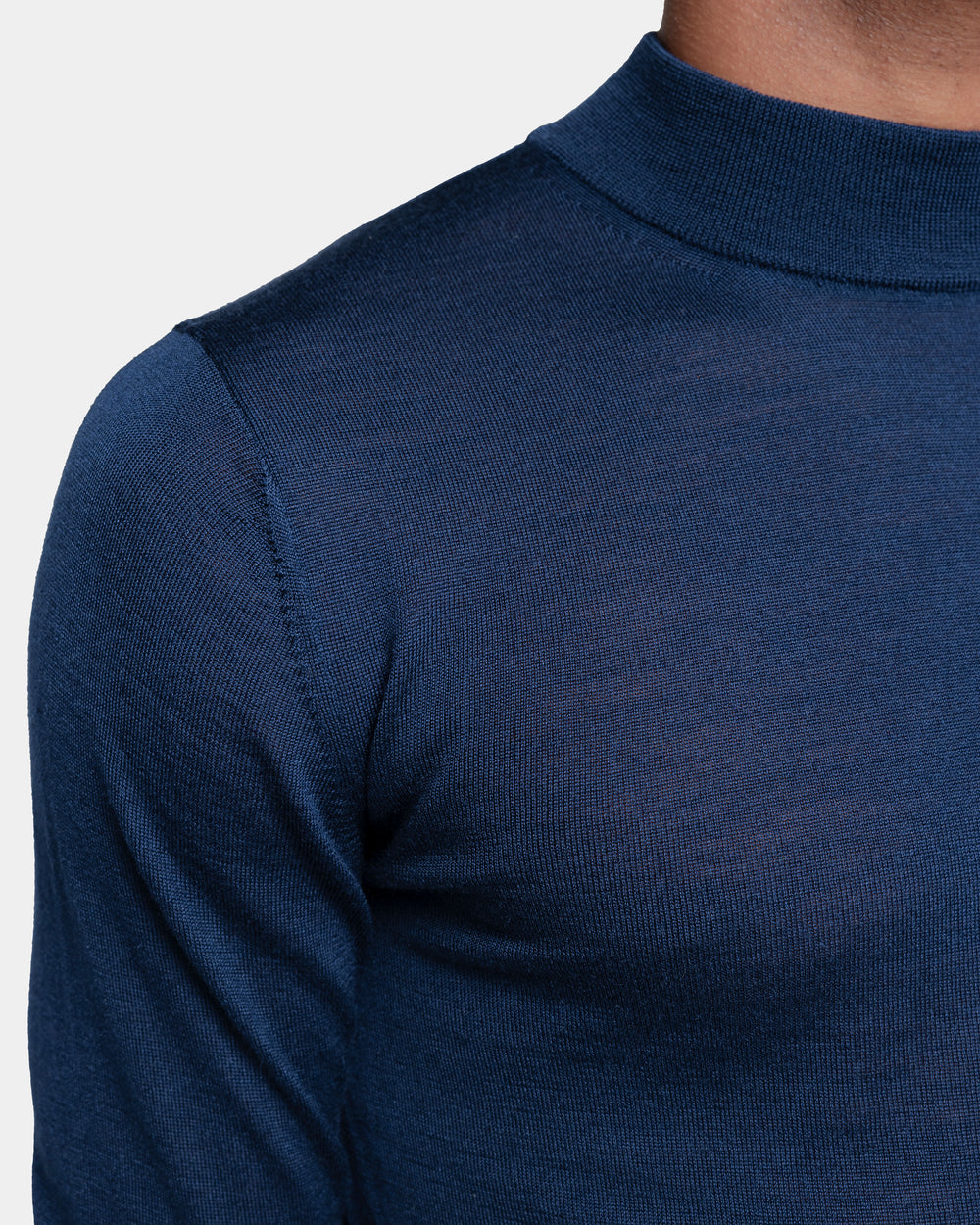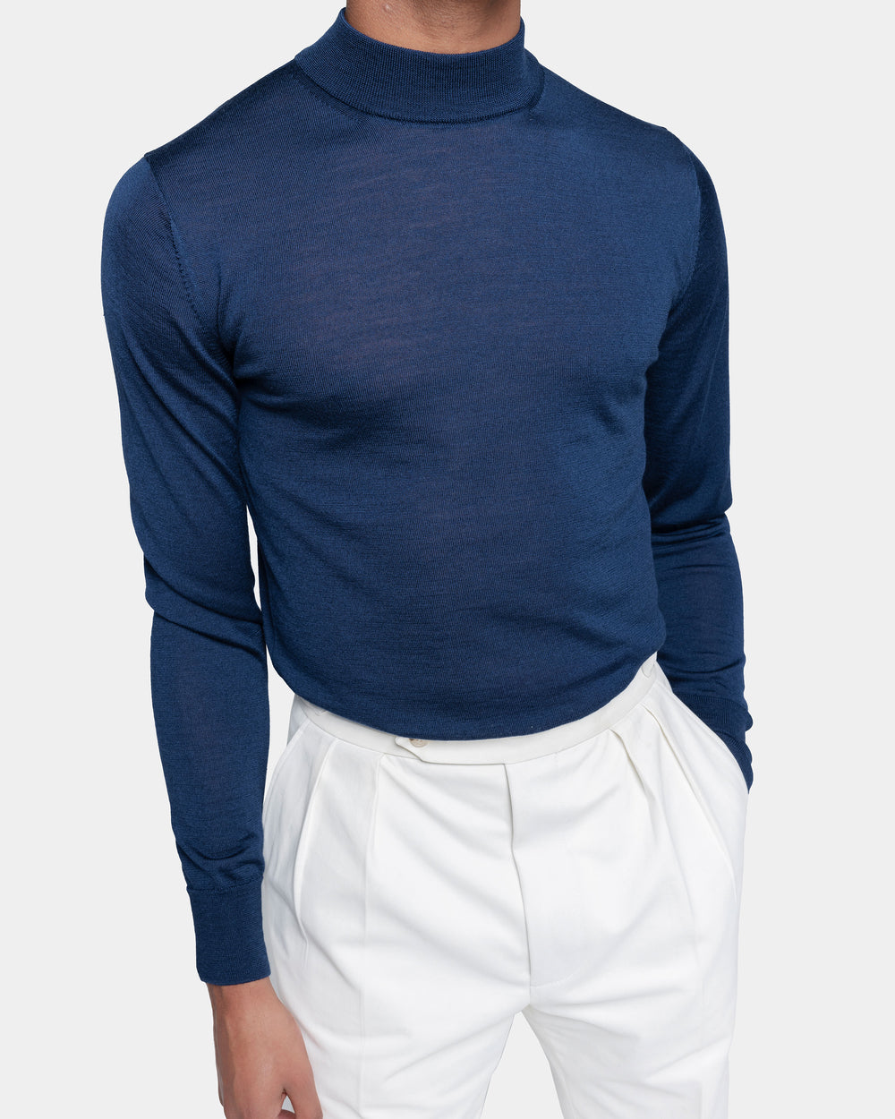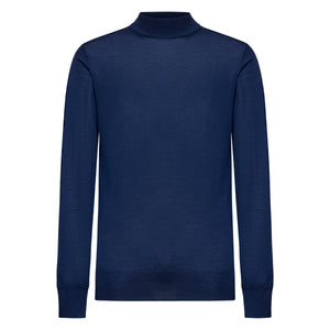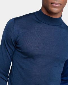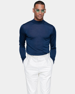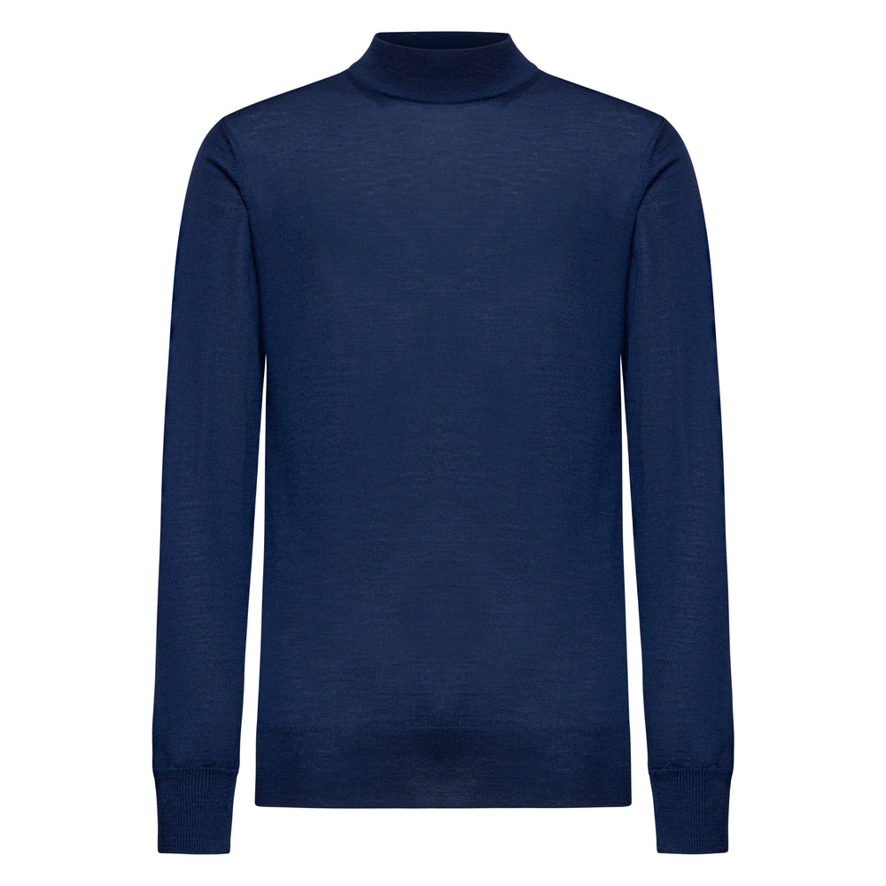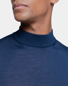 Tailor-made long sleeved highneck knitwear in Extrafine 2/48 Gauge Yarn, Solid Blue. Crafted from a luxurious, bright, and soft blend of 70% Extrafine Merino Wool and 30% Silk of exceptional quality.