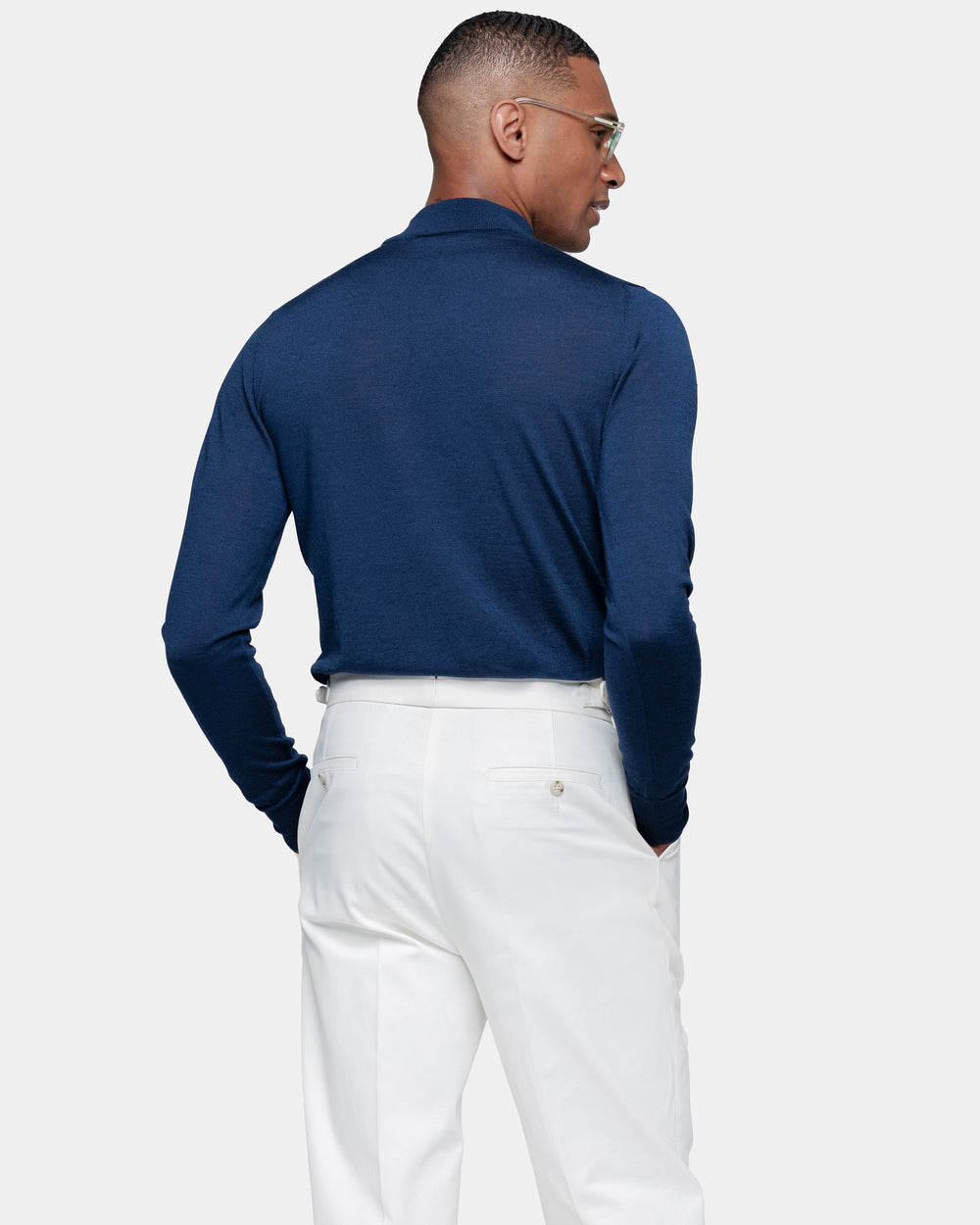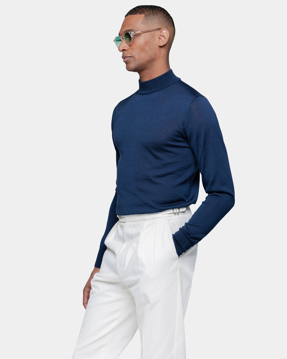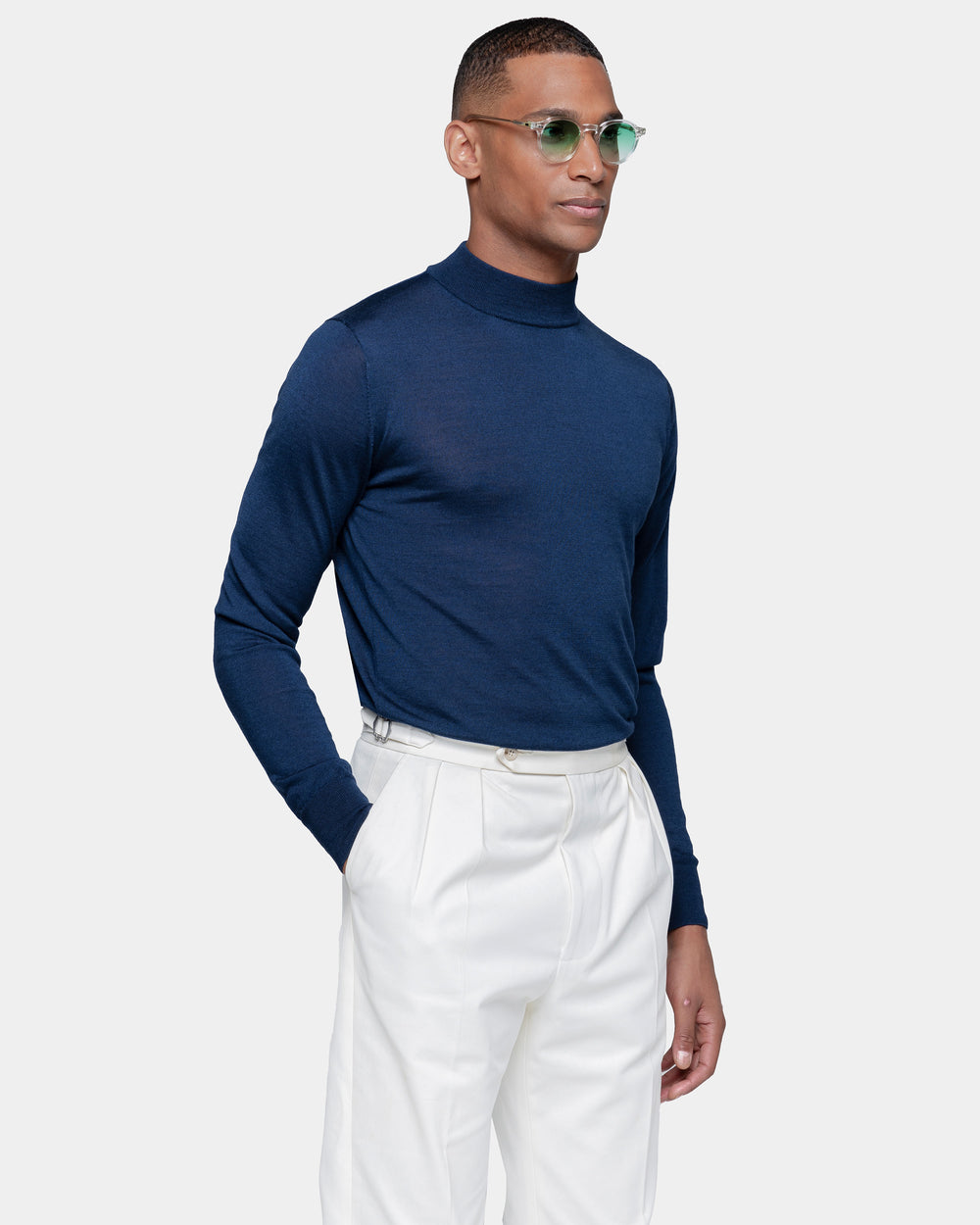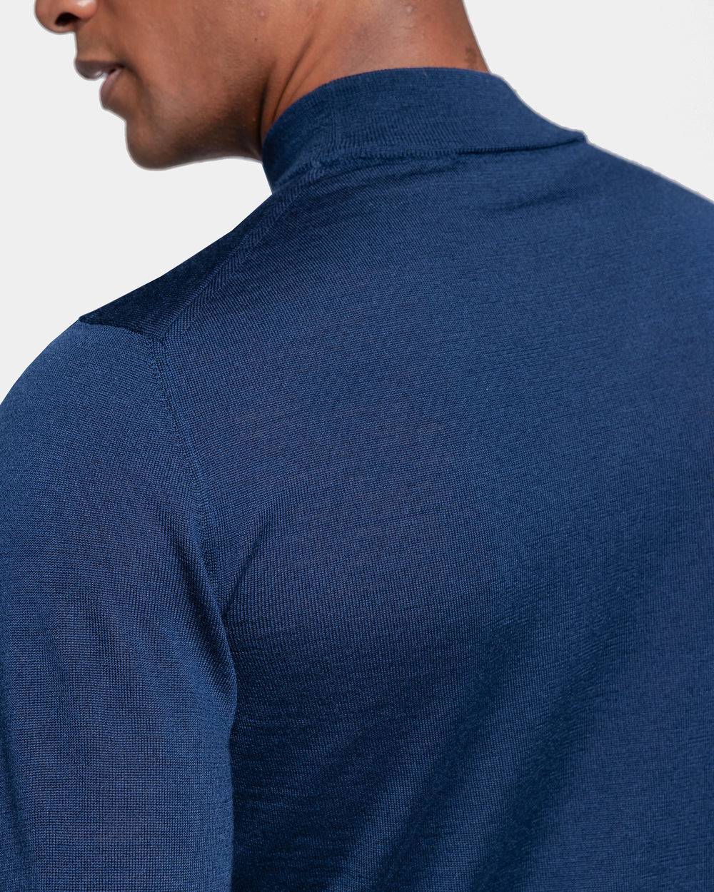 Tailor-made long sleeved highneck knitwear in Extrafine 2/48 Gauge Yarn, Solid Blue. Crafted from a luxurious, bright, and soft blend of 70% Extrafine Merino Wool and 30% Silk of exceptional quality.