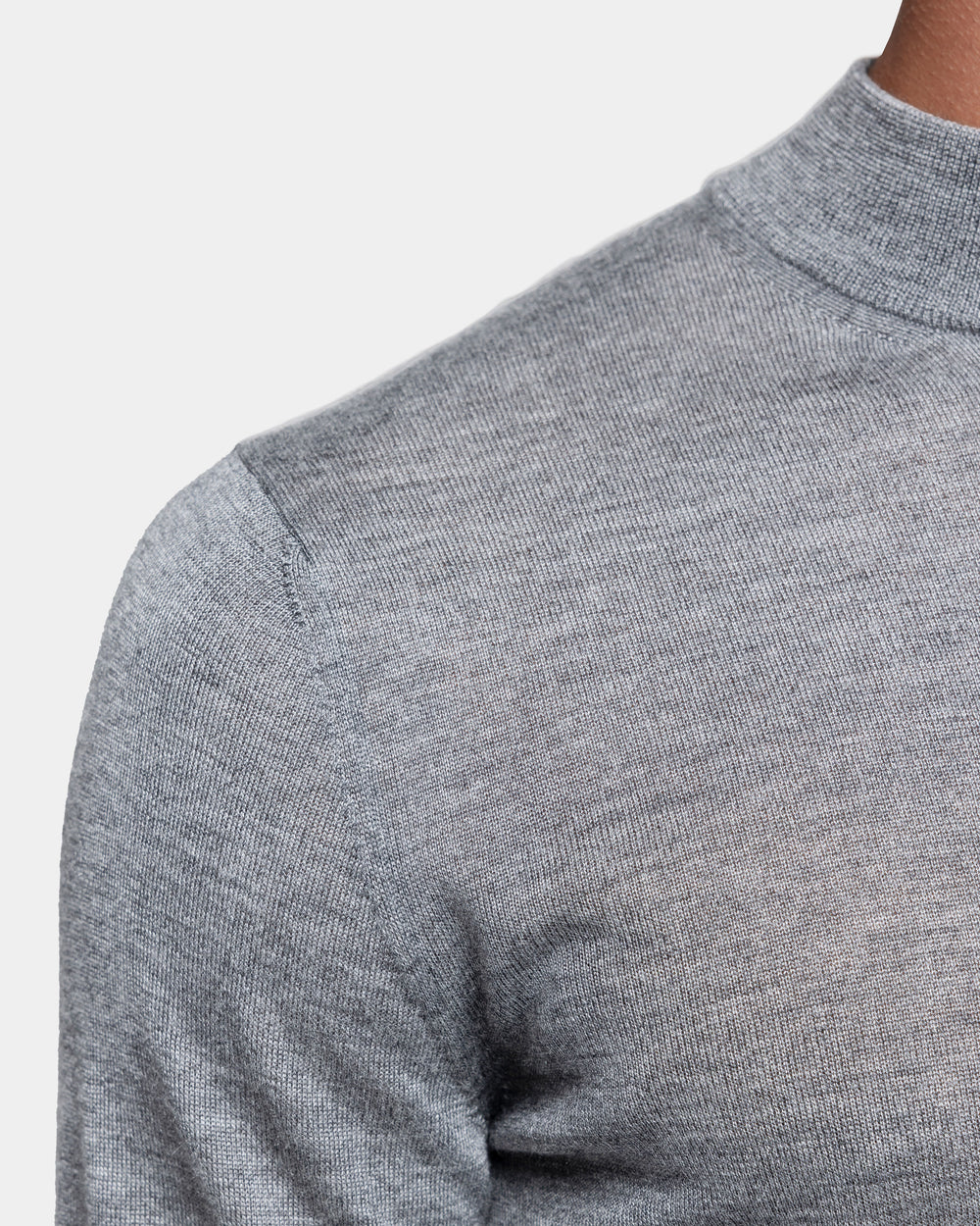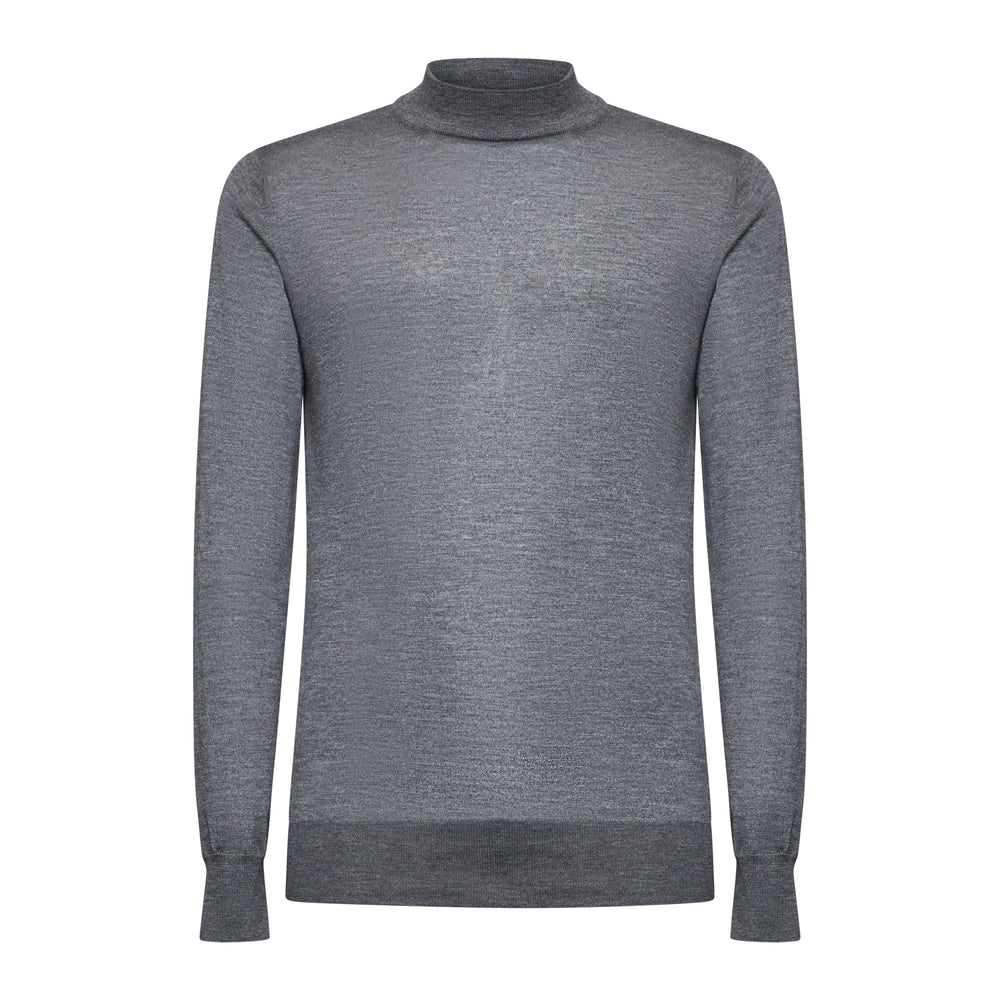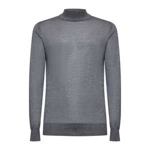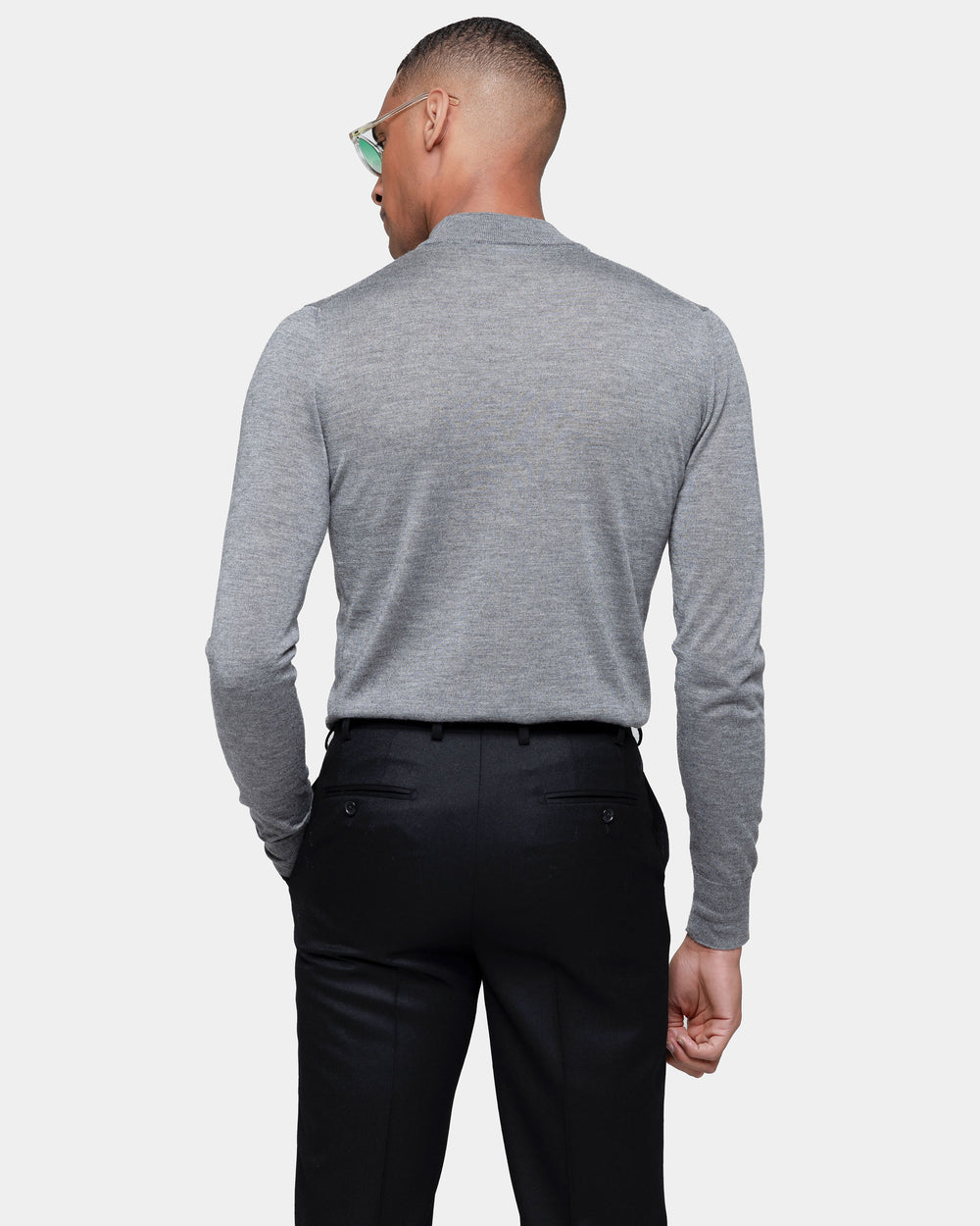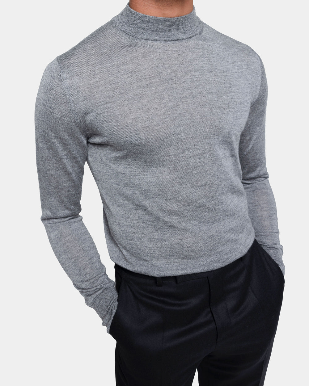 Tailor-made long-sleeved grey highneck knit, crafted from a custom-knitted ultra-fine gauge 2/48 1-ply yarn, made from a precious, shiny, and soft blend of ultra-fine cashmere and Mulberry silk, the rarest in the world.