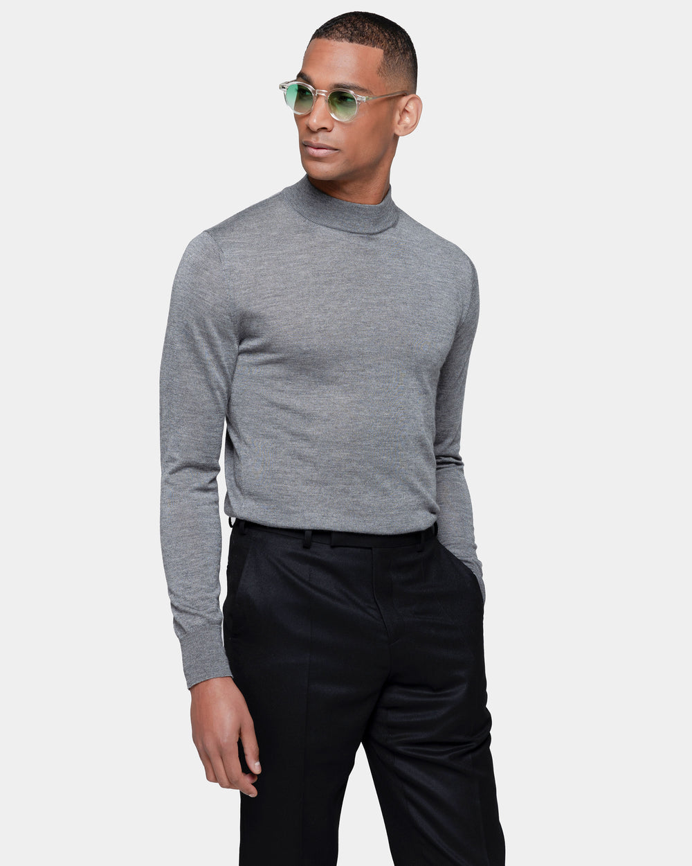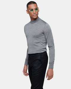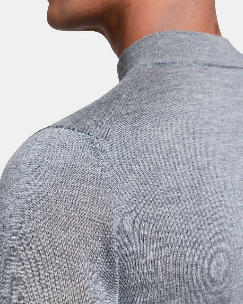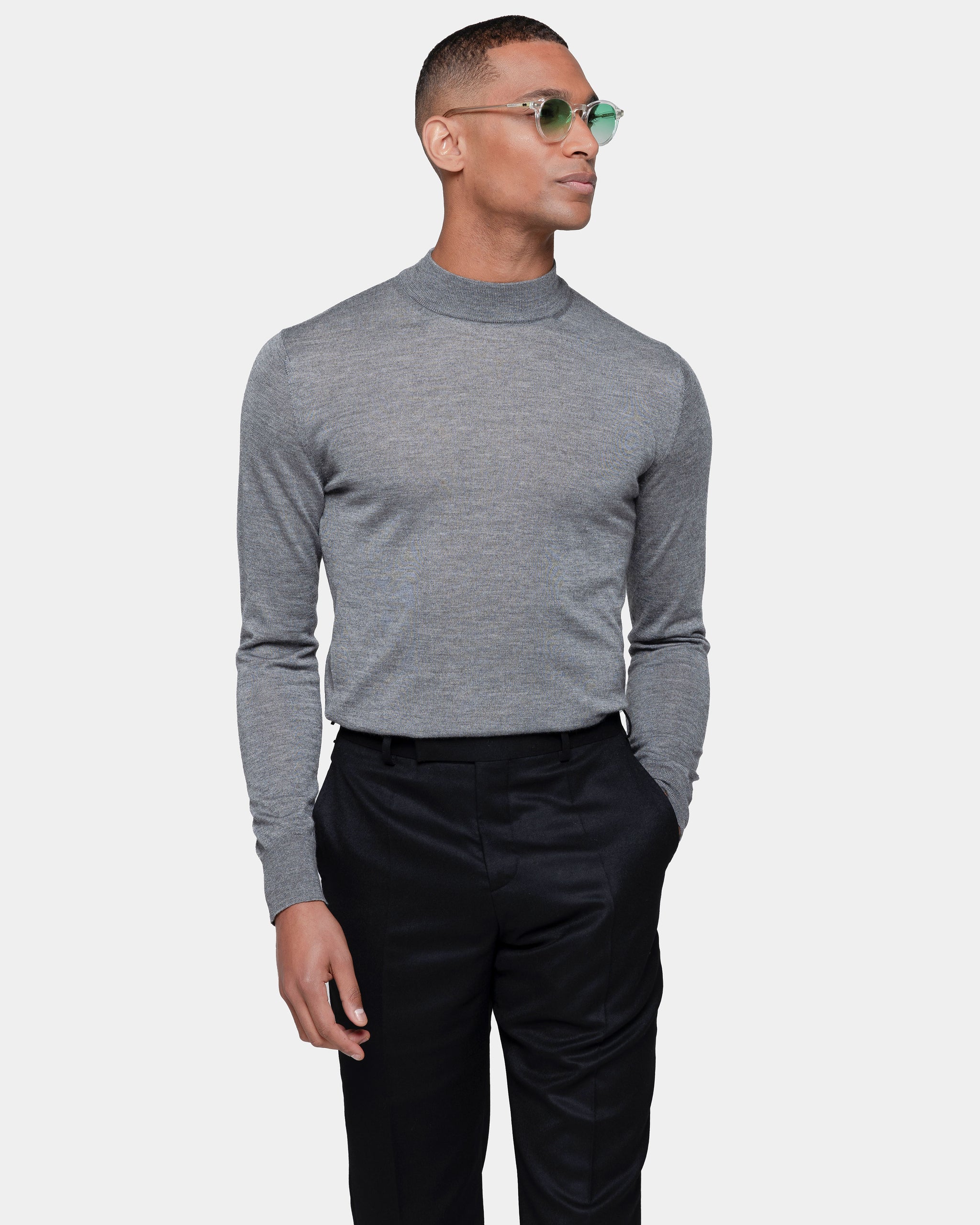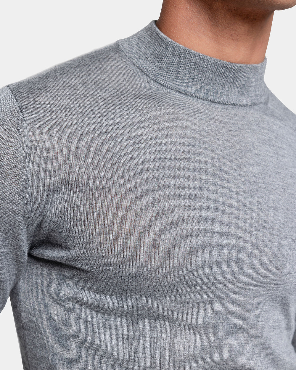 Tailor-made long-sleeved grey highneck knit, crafted from a custom-knitted ultra-fine gauge 2/48 1-ply yarn, made from a precious, shiny, and soft blend of ultra-fine cashmere and Mulberry silk, the rarest in the world.