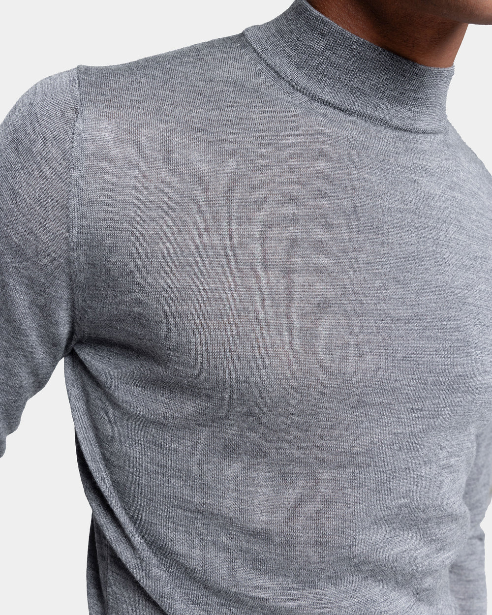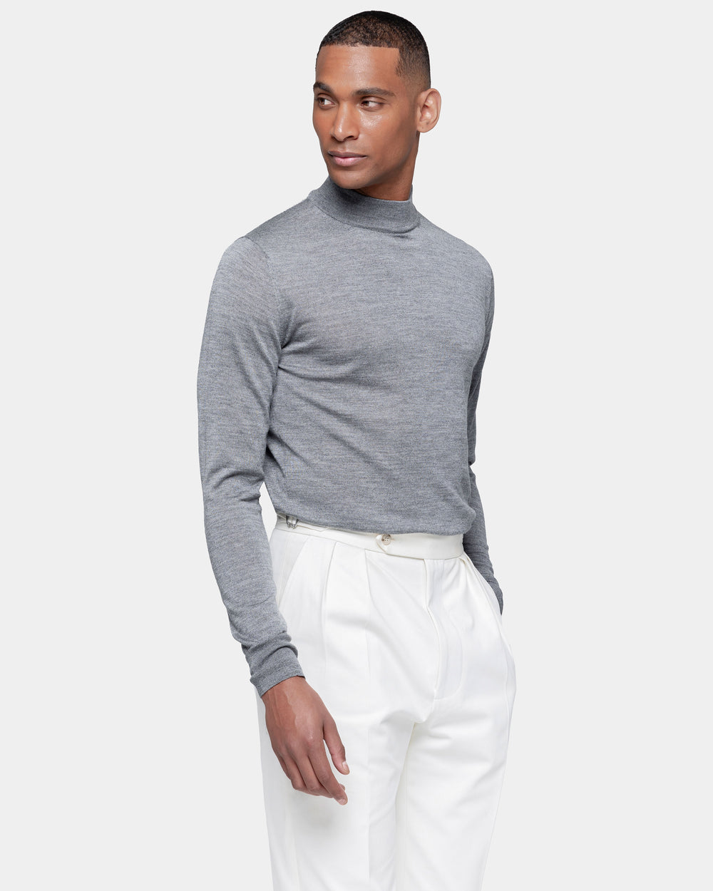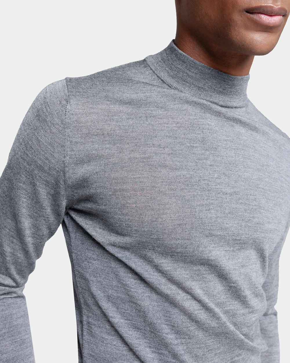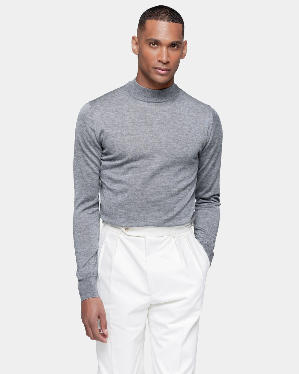 Tailor-made long sleeved highneck knitwear in Extrafine 2/48 Gauge Yarn, Solid Grey. Crafted from a luxurious, bright, and soft blend of 70% Extrafine Merino Wool and 30% Silk of exceptional quality.