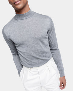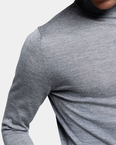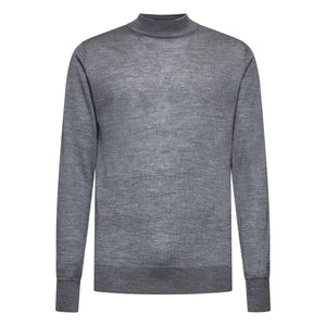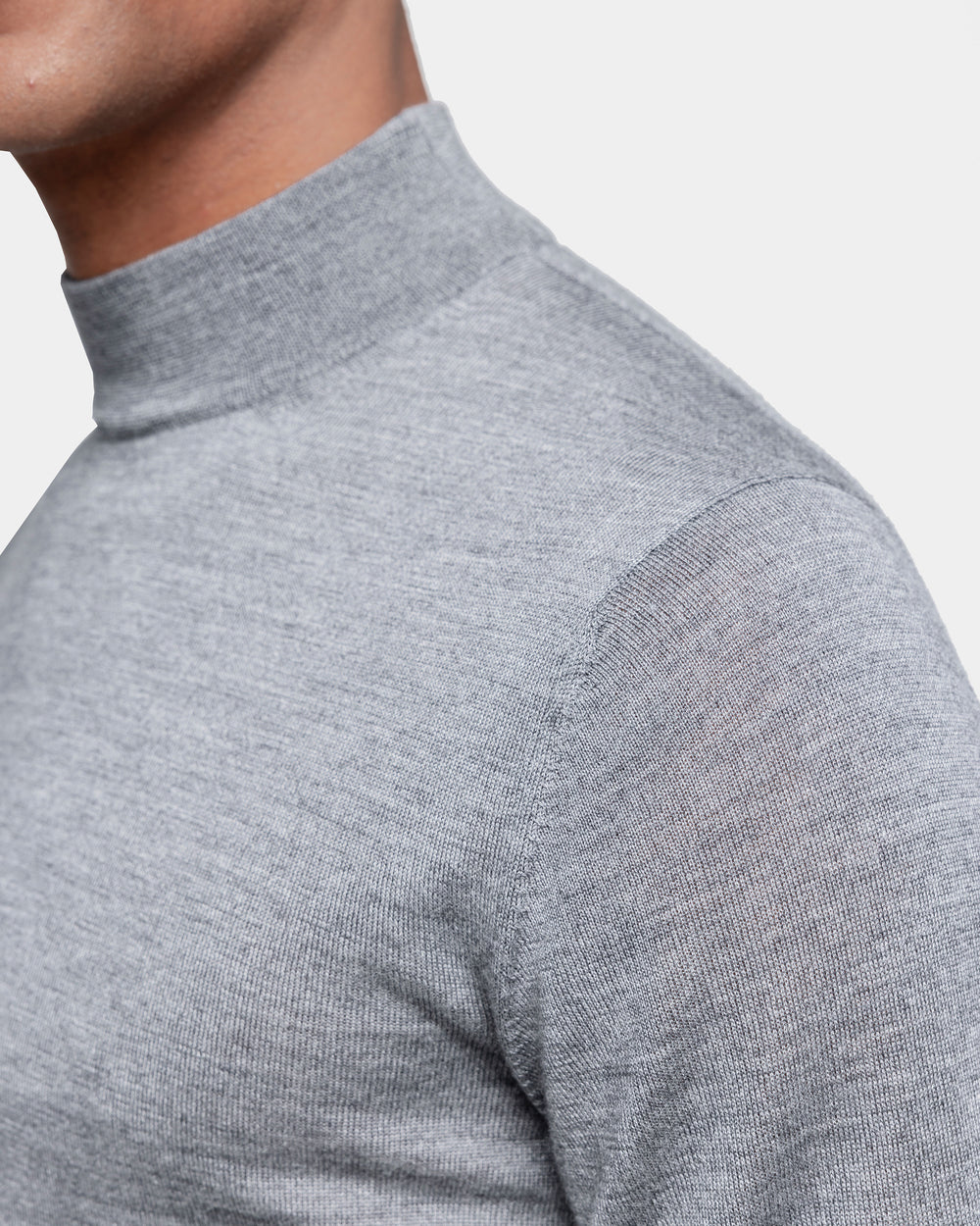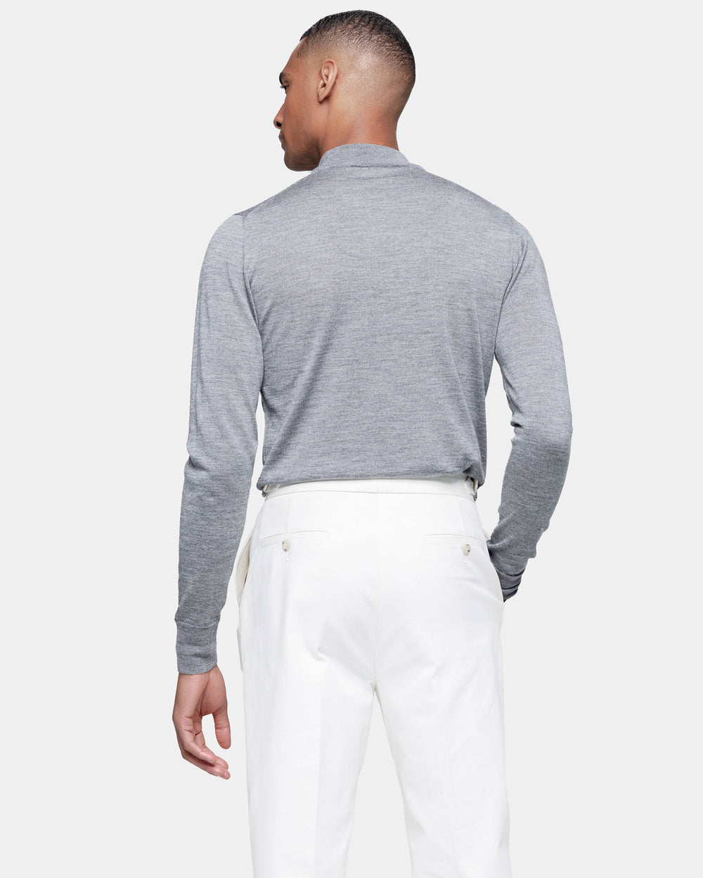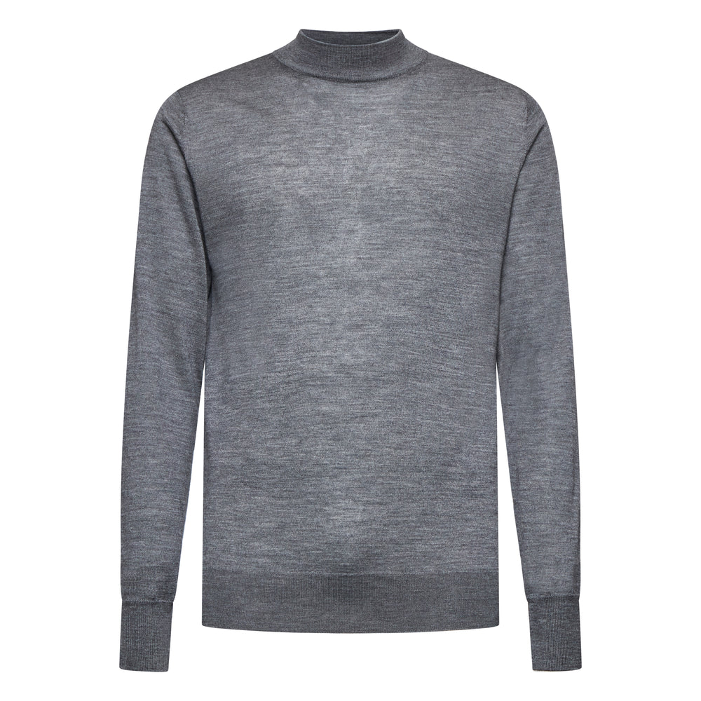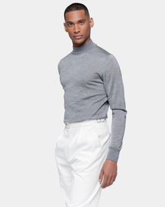 Tailor-made long sleeved highneck knitwear in Extrafine 2/48 Gauge Yarn, Solid Grey. Crafted from a luxurious, bright, and soft blend of 70% Extrafine Merino Wool and 30% Silk of exceptional quality.