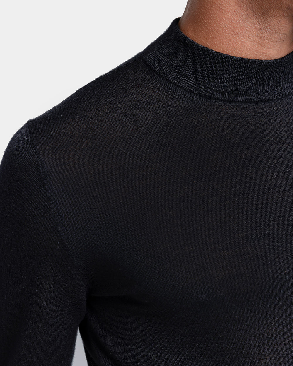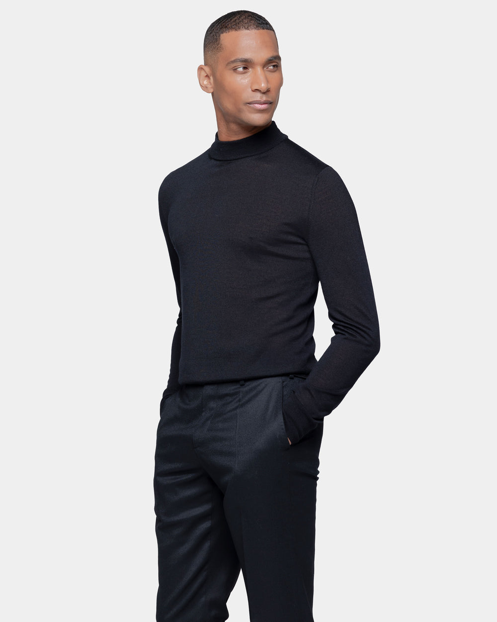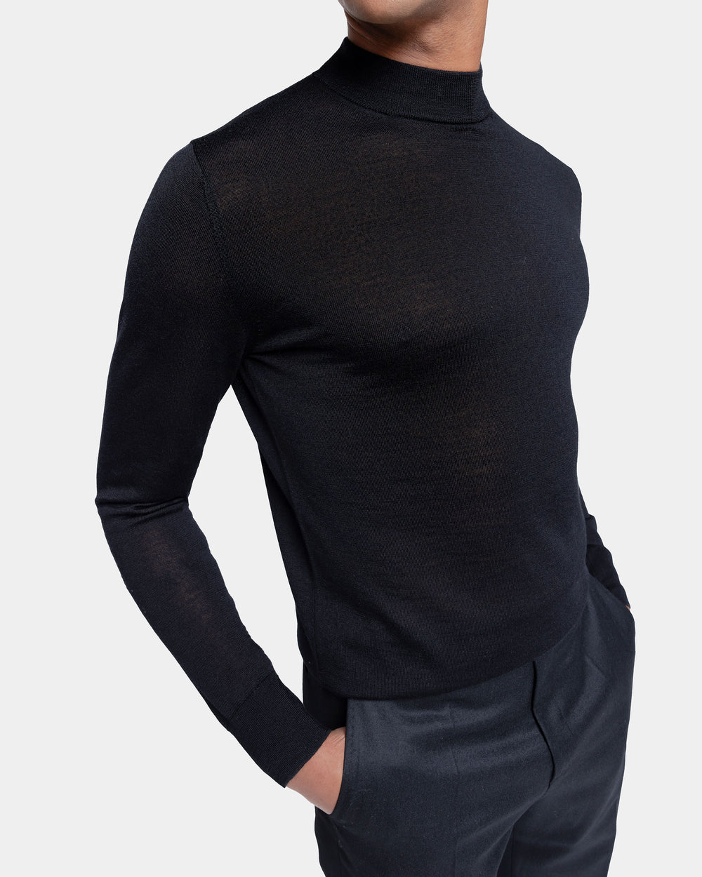 Tailor-made long sleeved highneck knitwear in Extrafine 2/48 Gauge Yarn, Solid Black. Crafted from a luxurious, bright, and soft blend of 70% Extrafine Merino Wool and 30% Silk of exceptional quality.