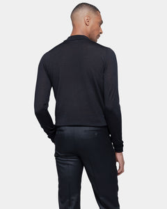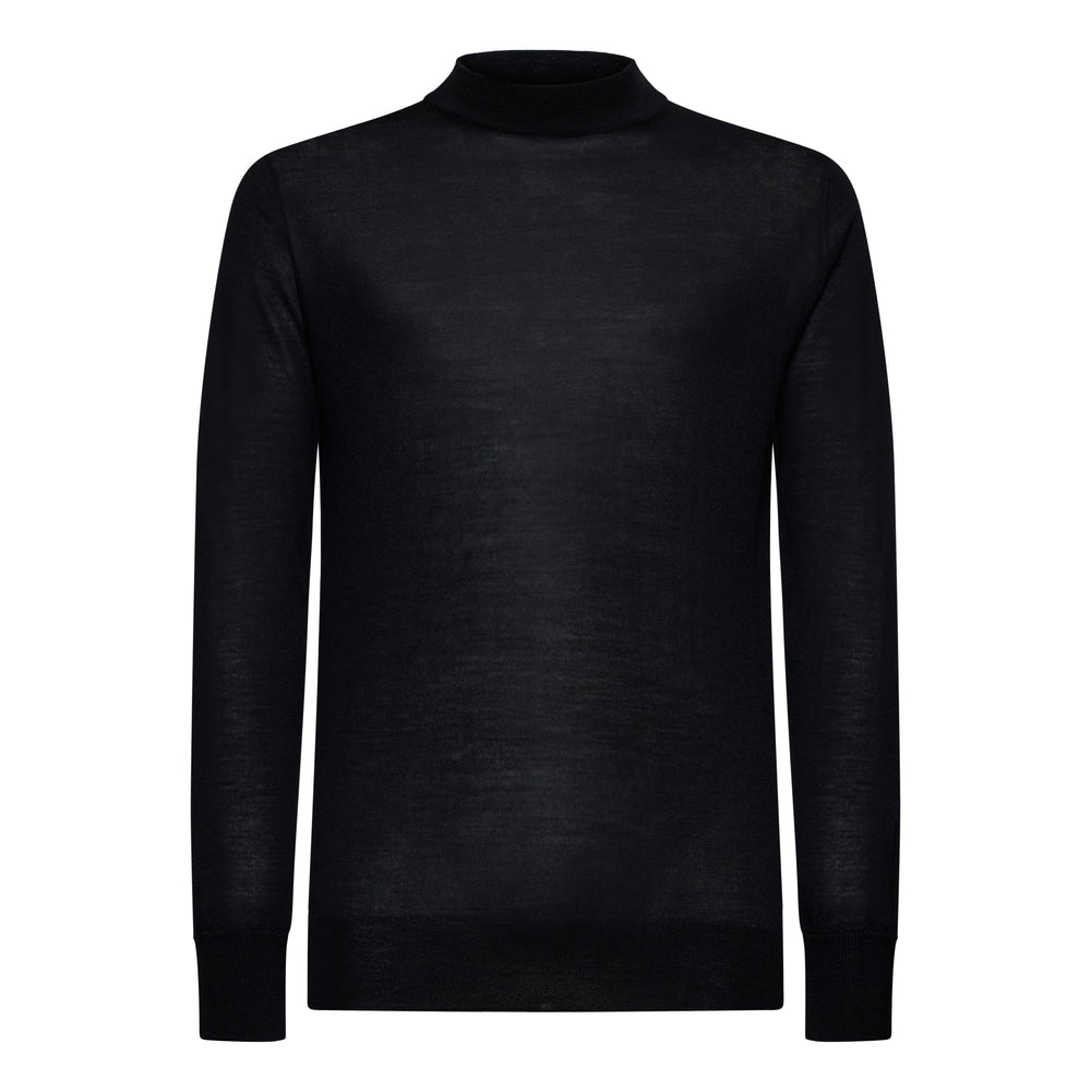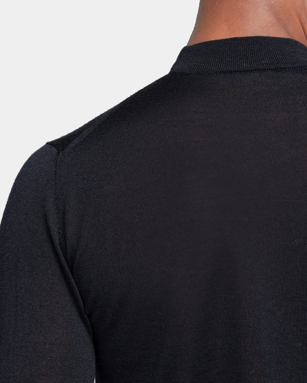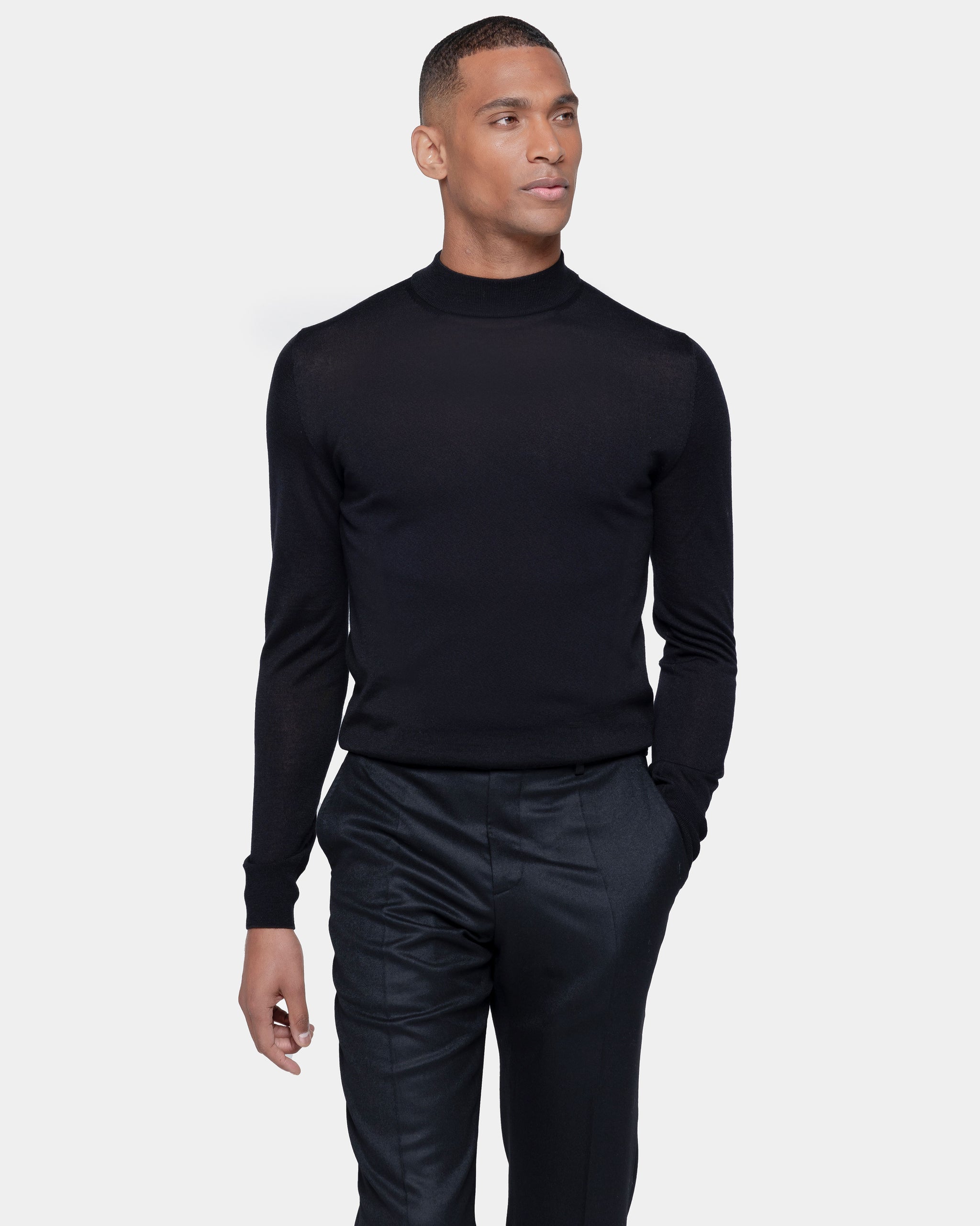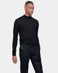 Tailor-made long sleeved highneck knitwear in Extrafine 2/48 Gauge Yarn, Solid Black. Crafted from a luxurious, bright, and soft blend of 70% Extrafine Merino Wool and 30% Silk of exceptional quality.
