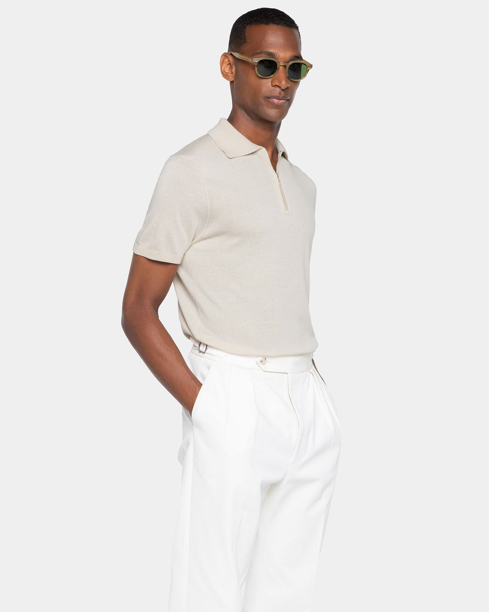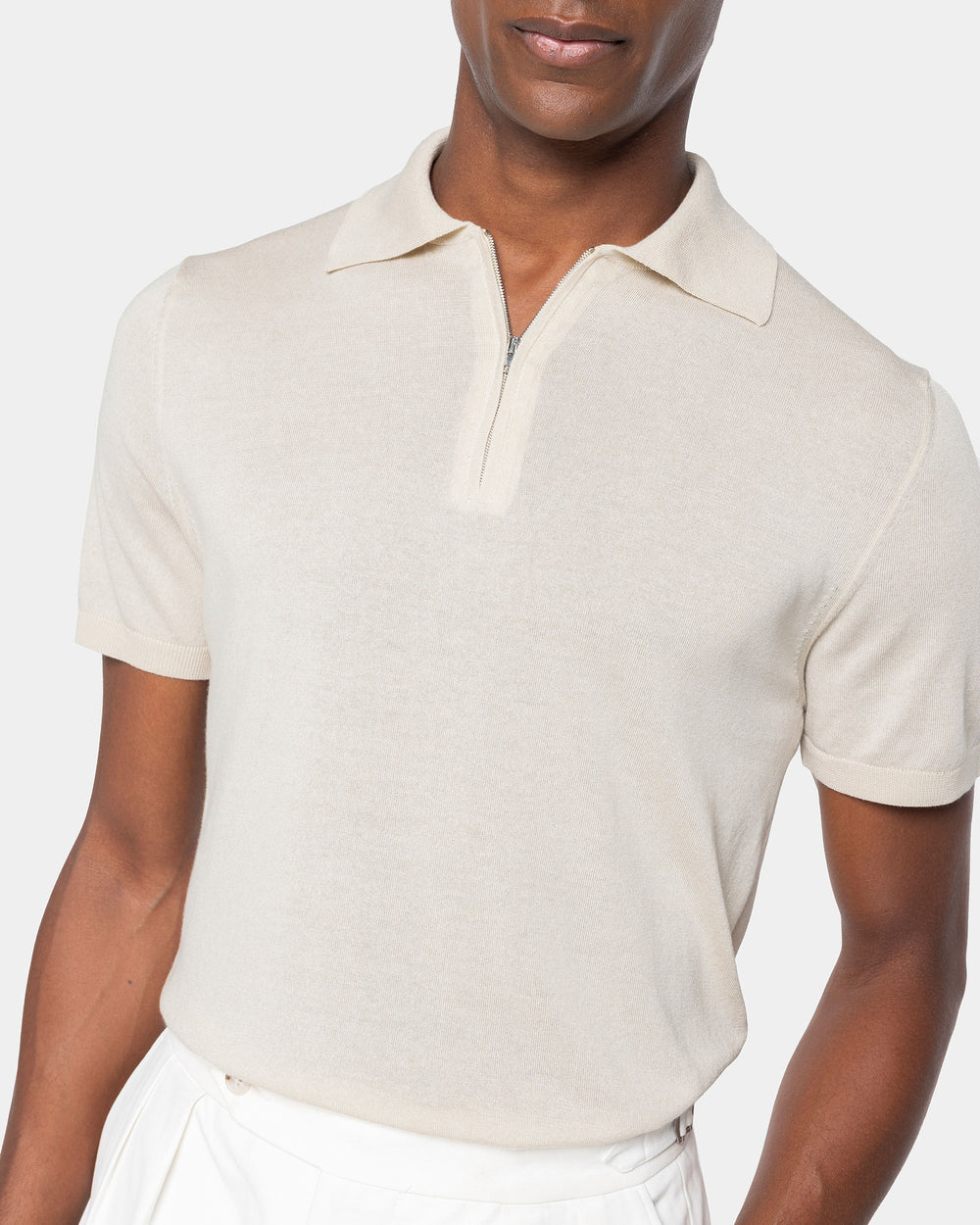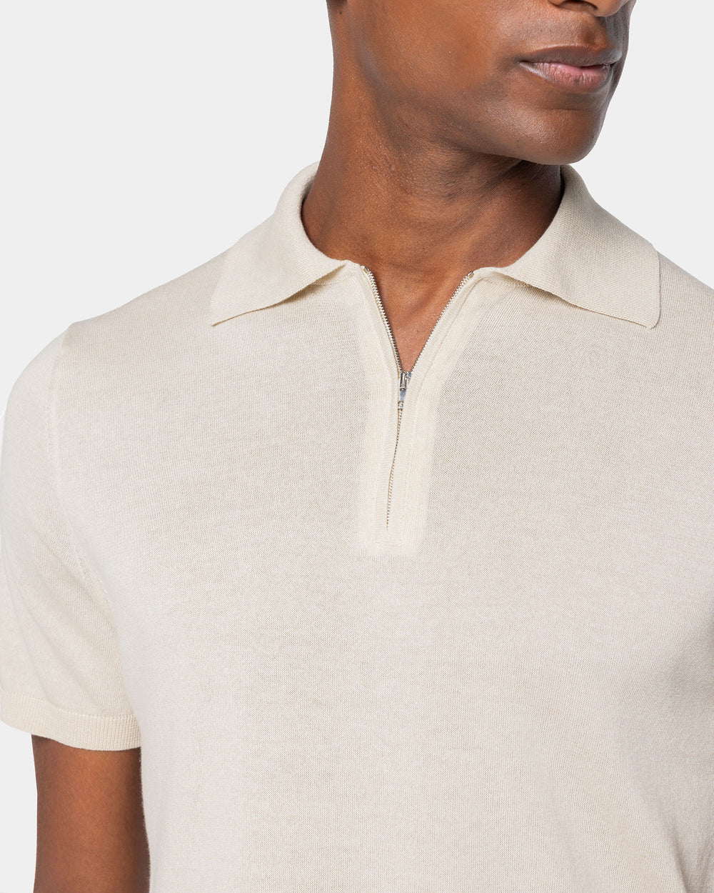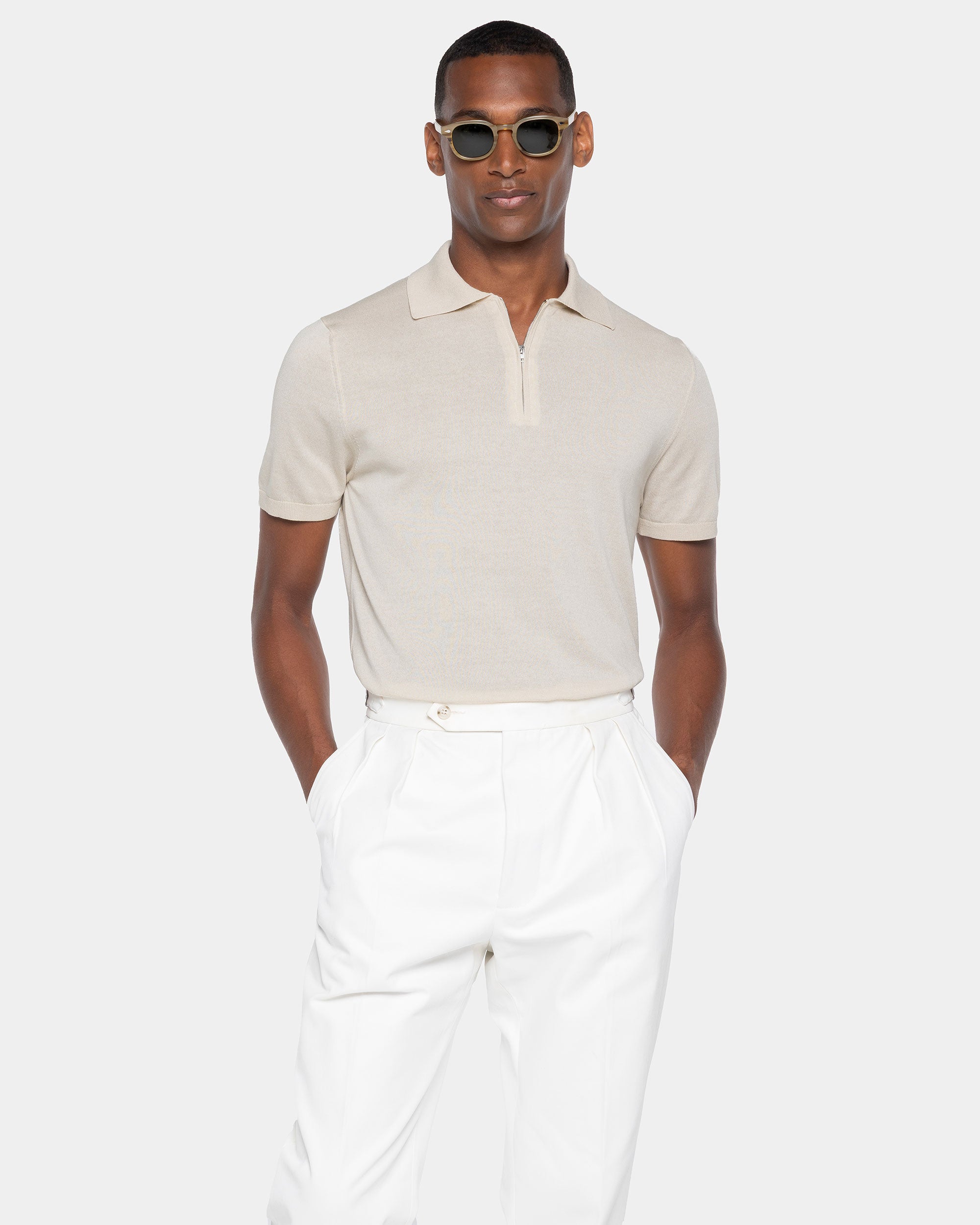 Tailor-made half-sleeve sand-colored zip polo with 15 cm nickel-free Riri zip, made from a luxurious, shiny, and soft combination of ultra-fine organic cotton and Mulberry silk, the rarest in the world, in a custom-knitted single-thread fabric with a gauge of 1/30,000.