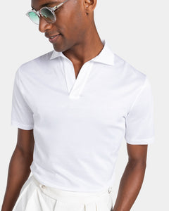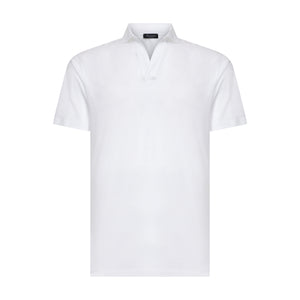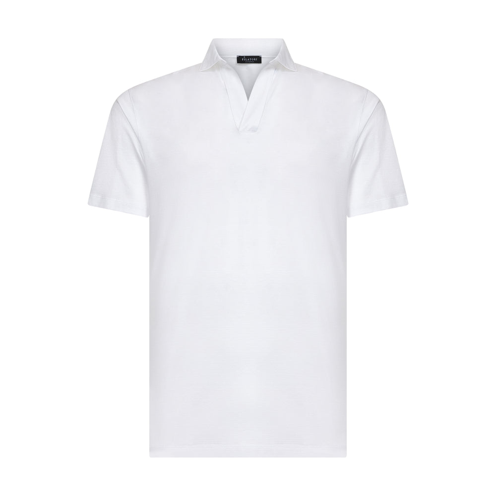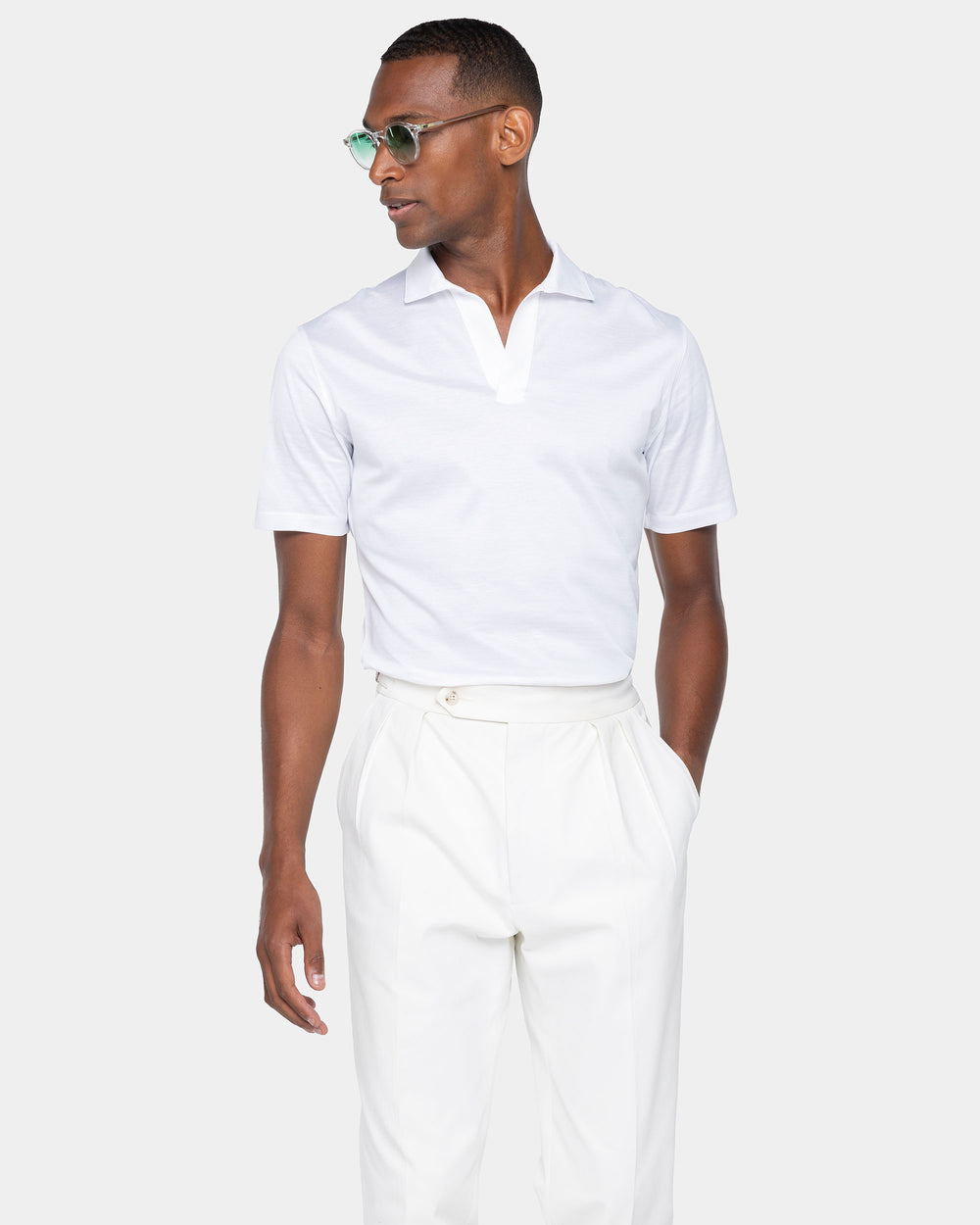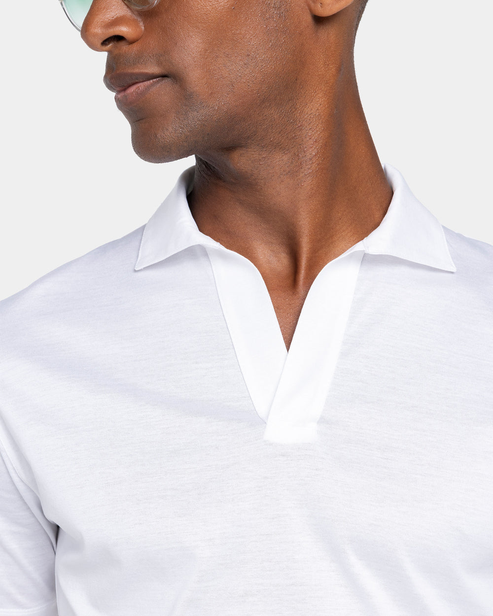 Made of 100% extra-fine 80/2 yarn-dyed jersey Filoscozia® Makò Egiziano cotton from the Italian weaving Tessilmaglia, this buttonless polo stands out for its lightness, sheen, and smooth, flowing hand: an essential and versatile piece designed for the contemporary wardrobe.