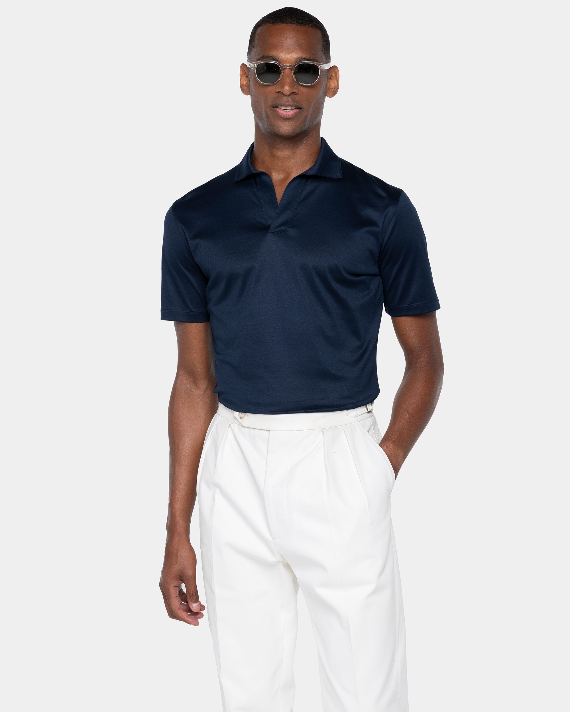 Made of 100% extra-fine 80/2 yarn-dyed jersey Filoscozia® Makò Egiziano cotton from the Italian weaving Tessilmaglia, this buttonless polo stands out for its lightness, sheen, and smooth, flowing hand: an essential and versatile piece designed for the contemporary wardrobe.