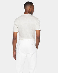 Expertly knitted on circular looms, the Masters of Linen® jersey is extraordinarily lightweight and airy, providing freshness and comfort even on the hottest days. Its subtly slubbed surface and melange effect lend the piece a refined, textural elegance.