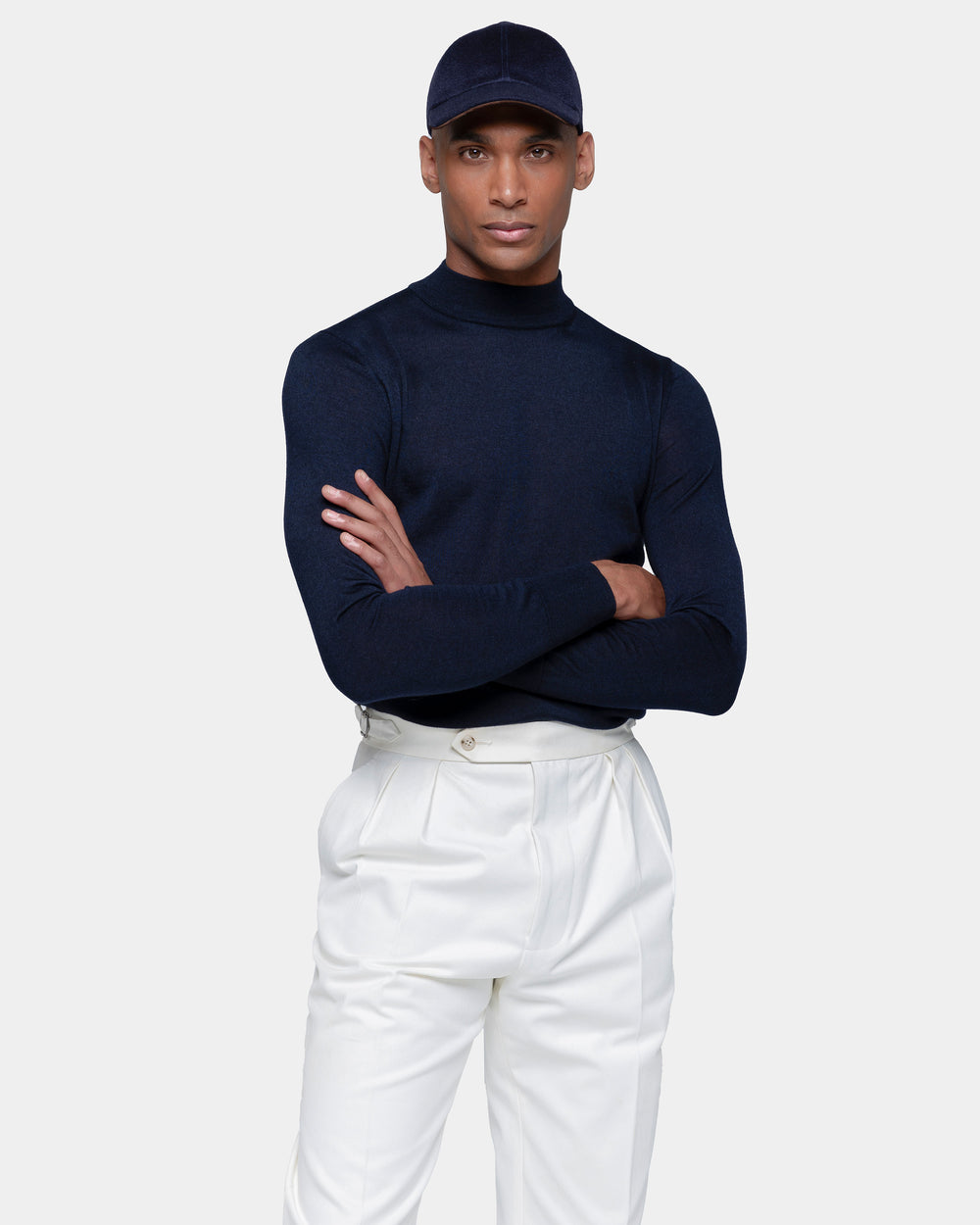 Cappellino baseball su misura a sei spicchi realizzato in pregiato 100% Cashmere del Lanificio Colombo, simbolo in tutto il mondo nella produzione del cashmere più pregiato e ricercato. Questo accessorio esclusivo combina calore, morbidezza e uno stile senza pari, offrendo una soluzione ideale per affrontare le giornate con eleganza.