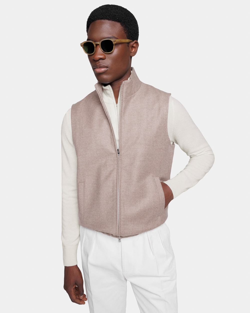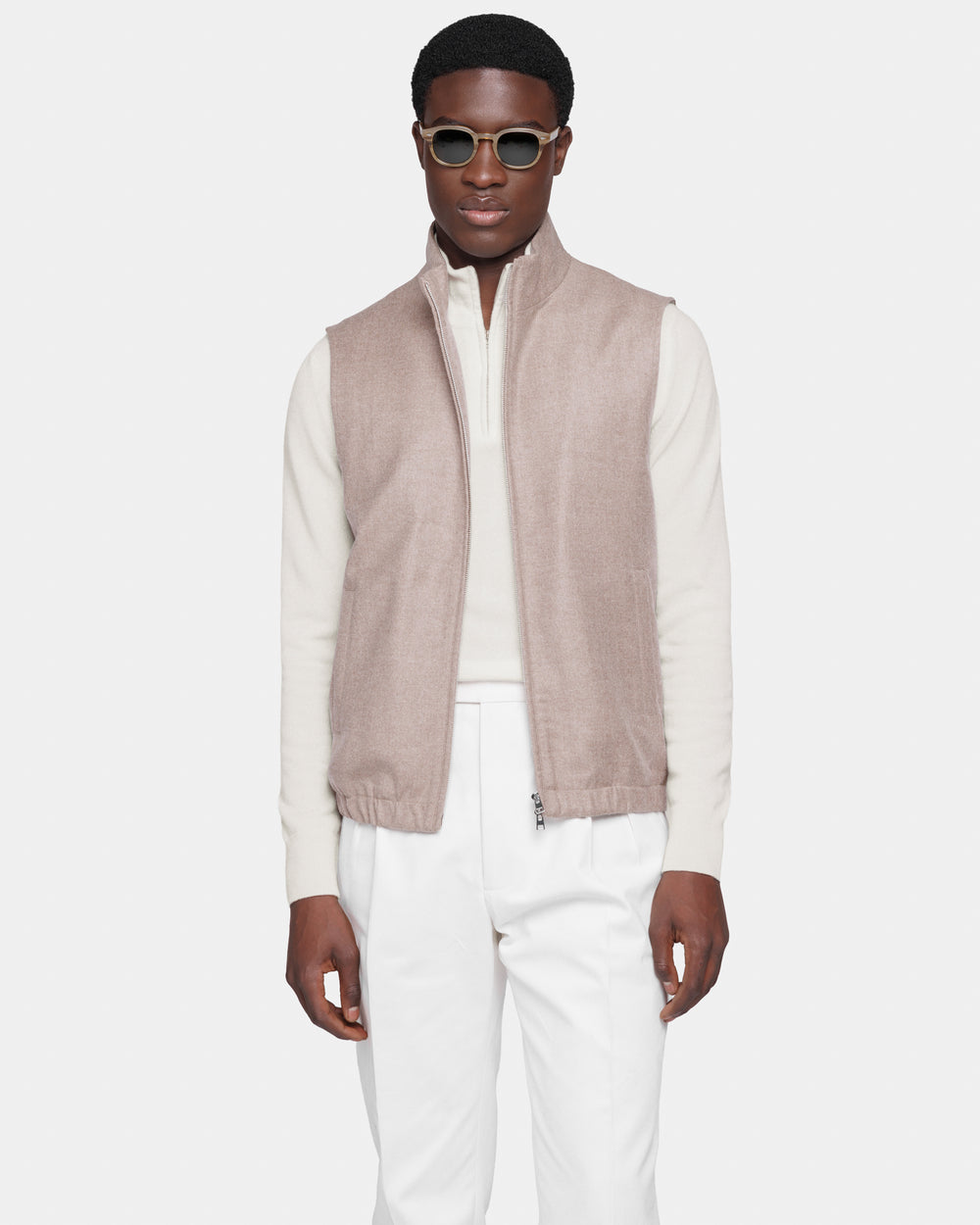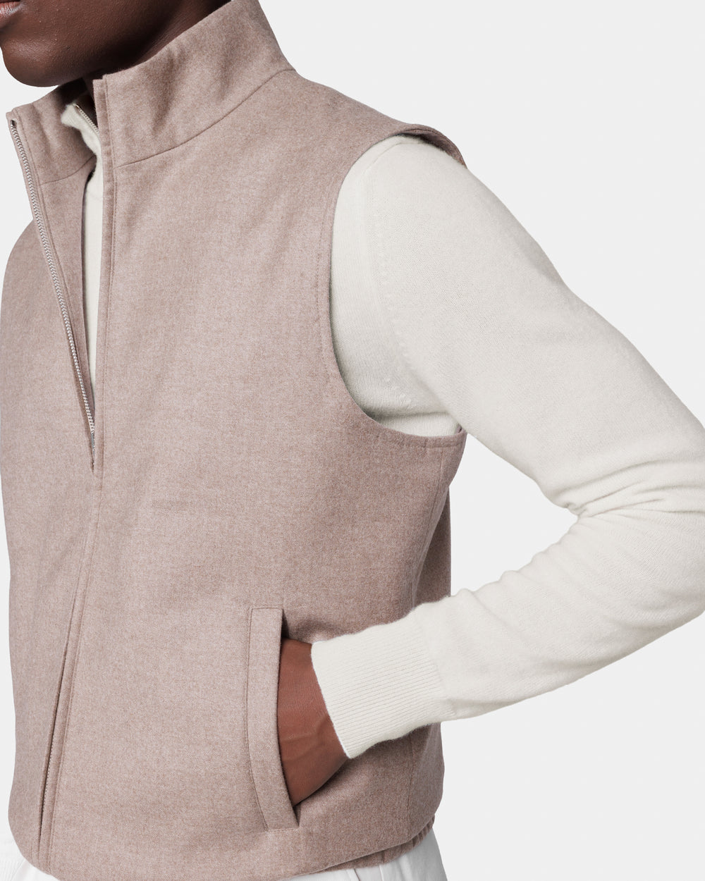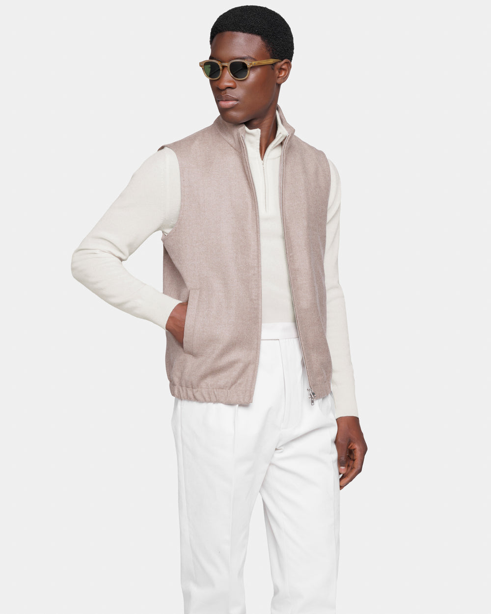 Gilet su misura color sabbia in tessuto idrorepellente 95% lana e 5% cashmere, con zip frontale con doppio cursore e collo in piedi, non imbottito, progettato per una sovrapposizione impeccabile e una elevata funzionalità nel guardaroba contemporaneo.
