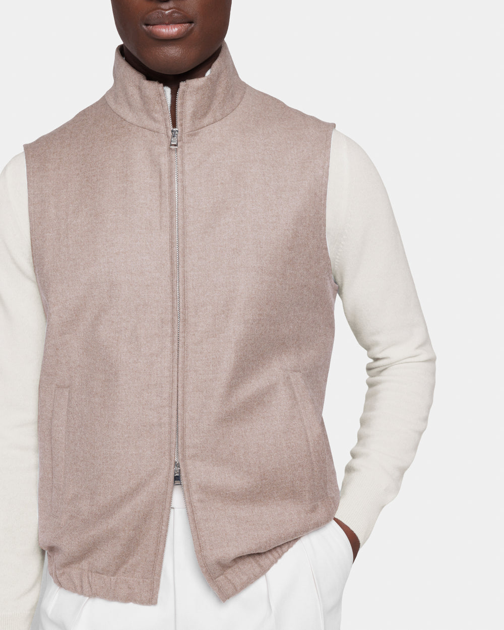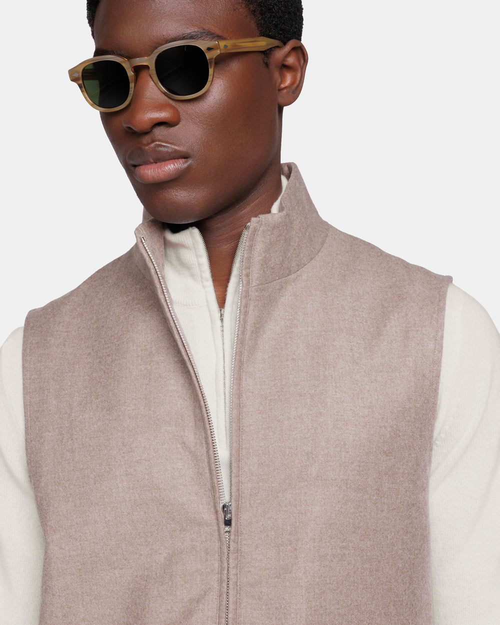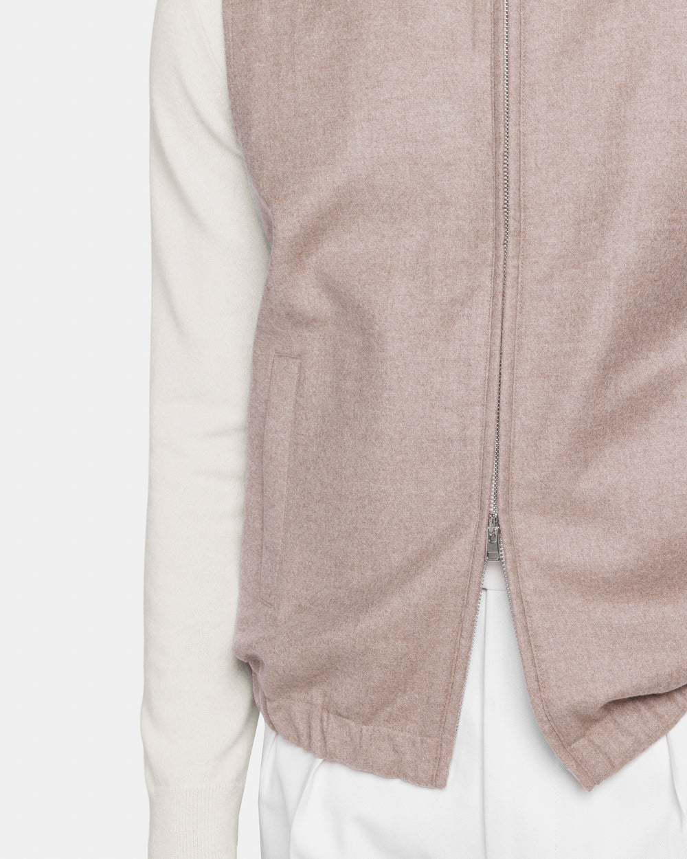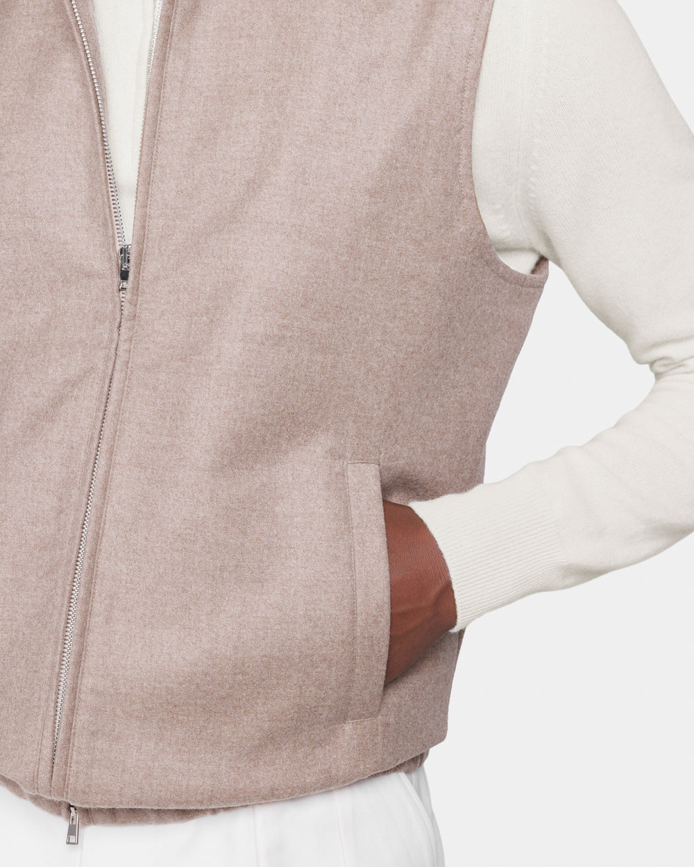 Gilet su misura color sabbia in tessuto idrorepellente 95% lana e 5% cashmere, con zip frontale con doppio cursore e collo in piedi, non imbottito, progettato per una sovrapposizione impeccabile e una elevata funzionalità nel guardaroba contemporaneo.