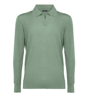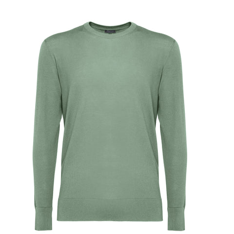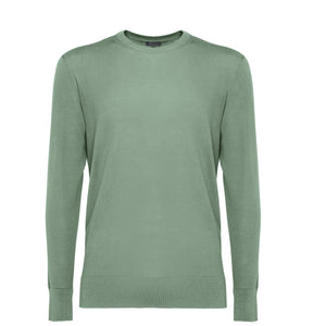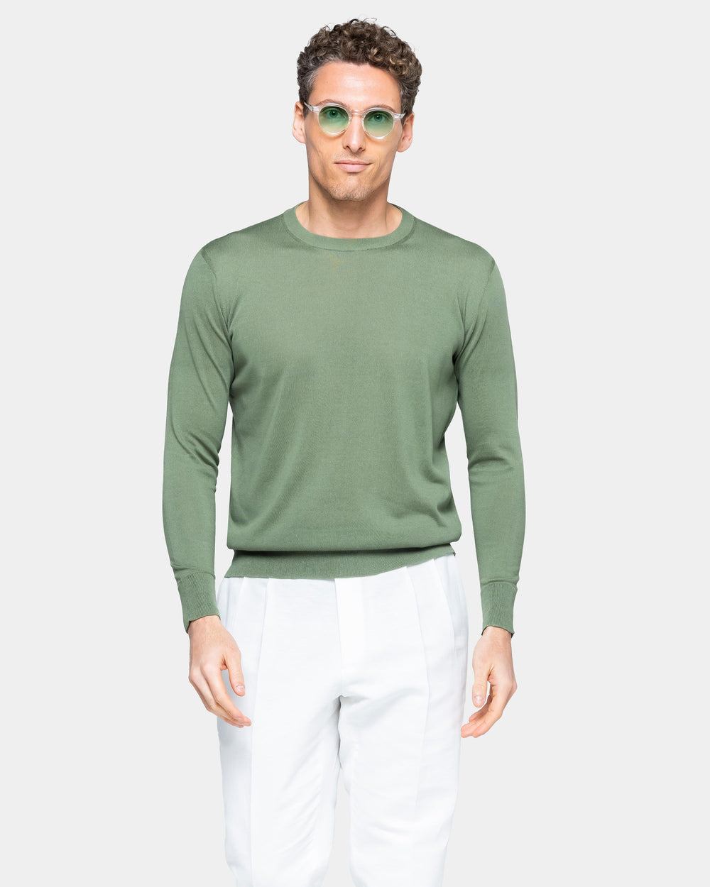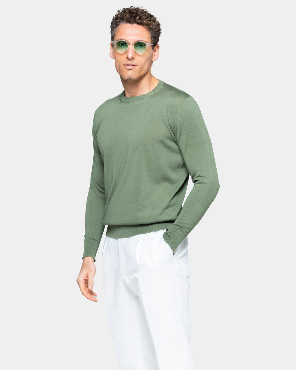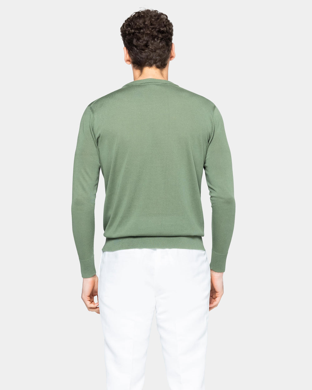 Maglia rasata ad 1 filo ultra-fine dal titolo 1/30.000 a maniche lunghe tinta unita verde militare, realizzata in una pregiata, brillante e morbida combinazione di finissimo cotone biologico e seta Mulberry, la più rara al mondo.