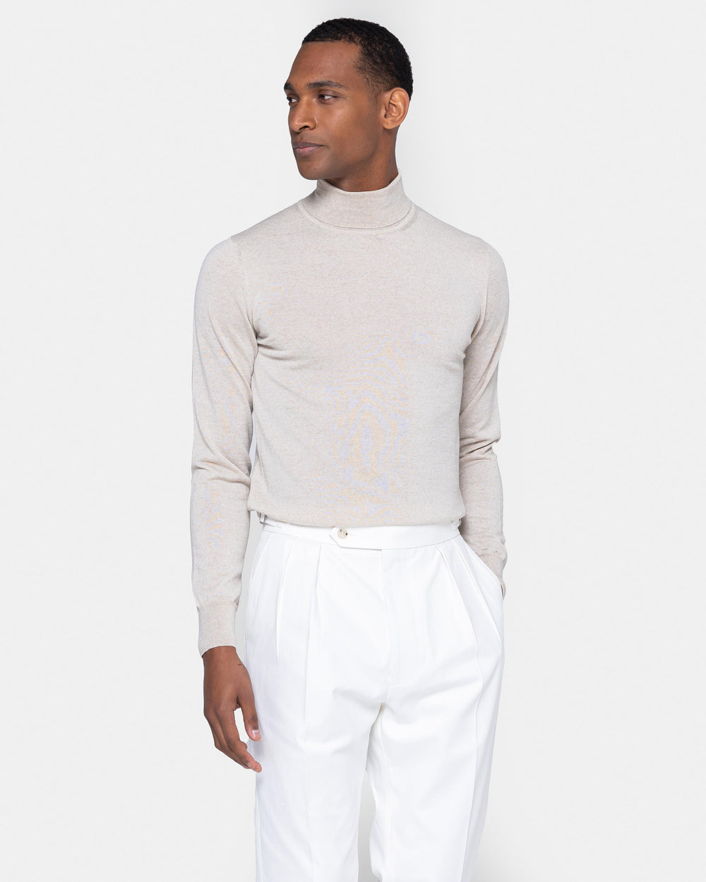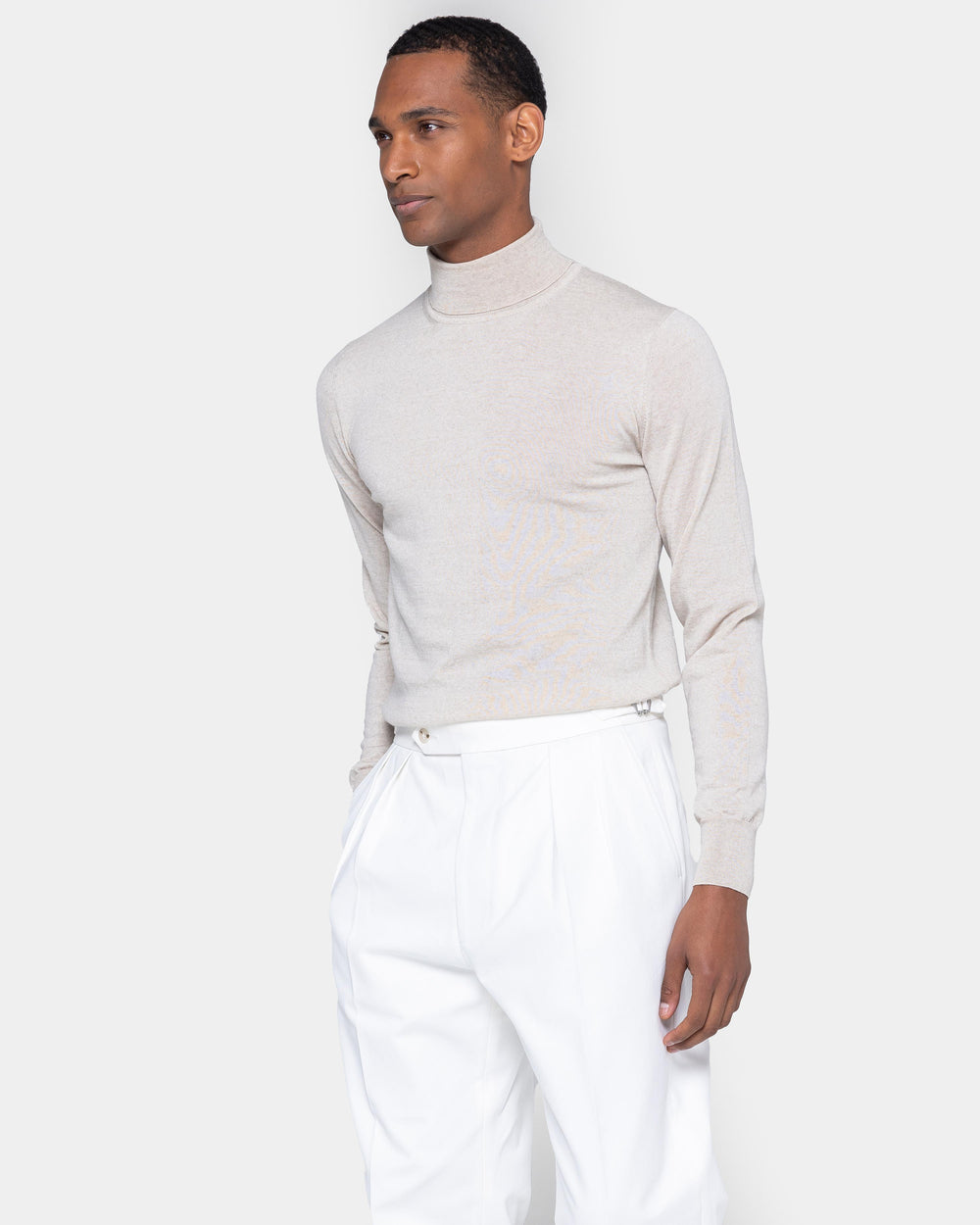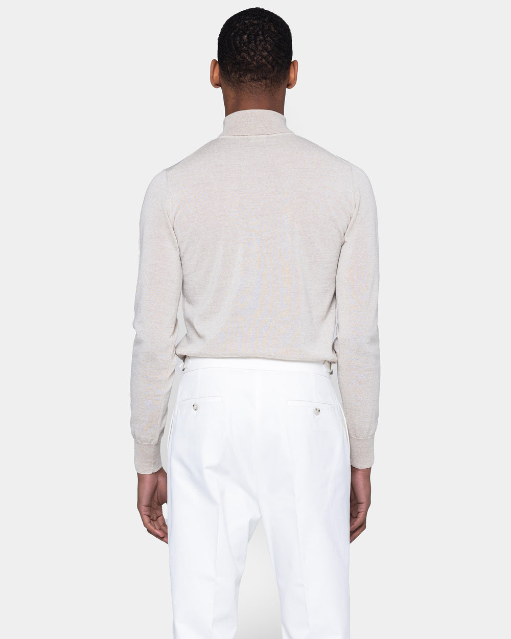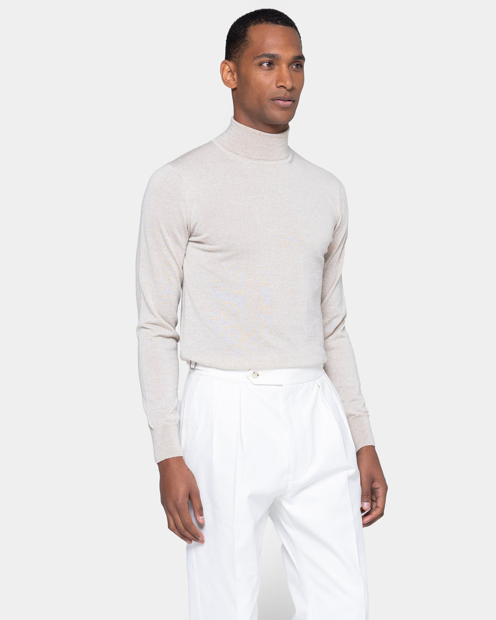 Maglia dolcevita rasata ad 1 filo extra-fine dal titolo 2/48 a maniche lunghe tinta unita sabbia, realizzata in lussuoso, brillante e morbido filato Cashwool®, 100% lana merino australiana extra-fine, la più pregiata al mondo.