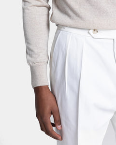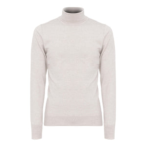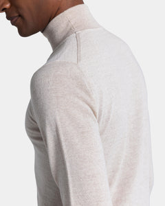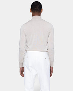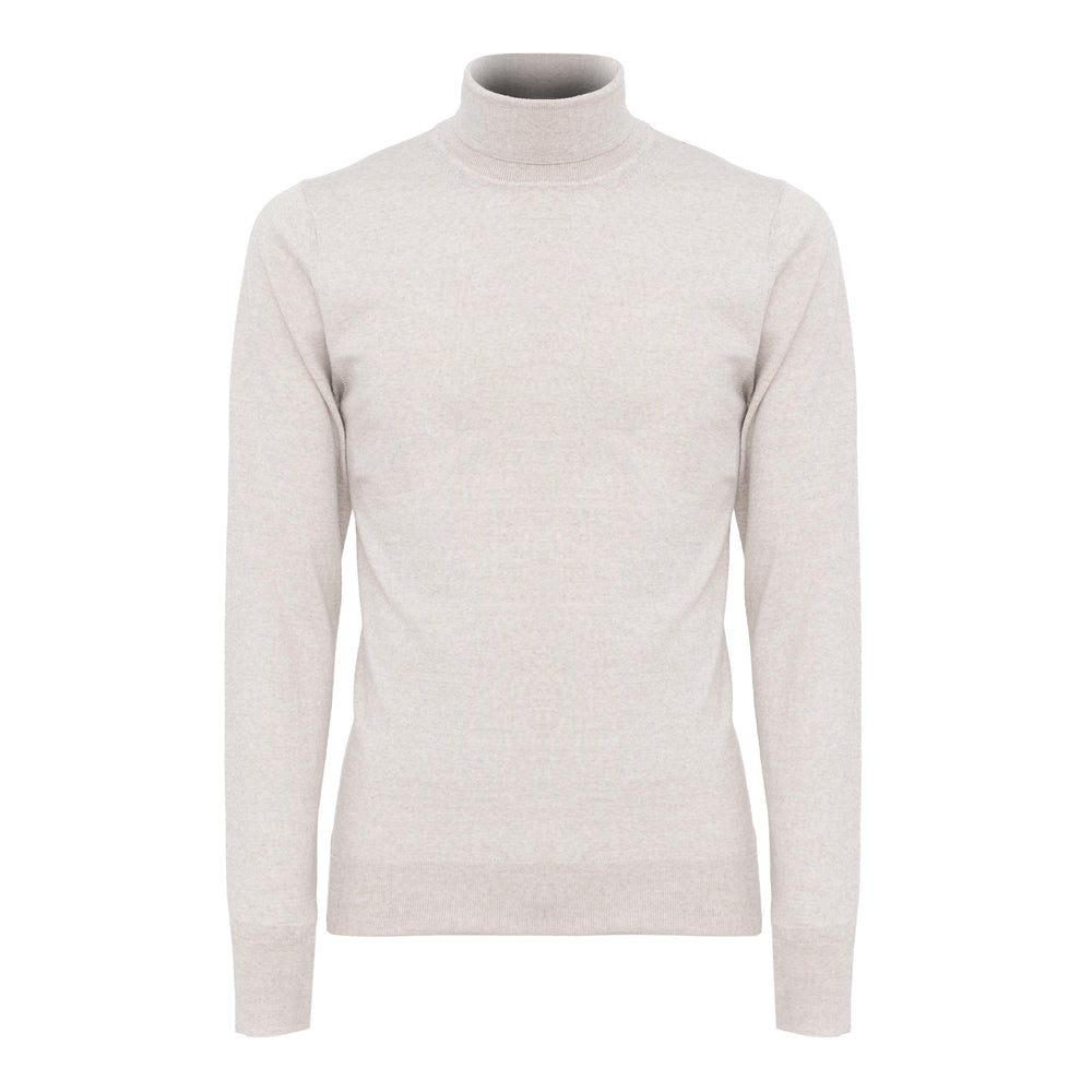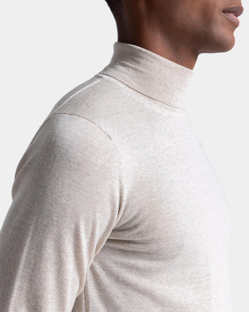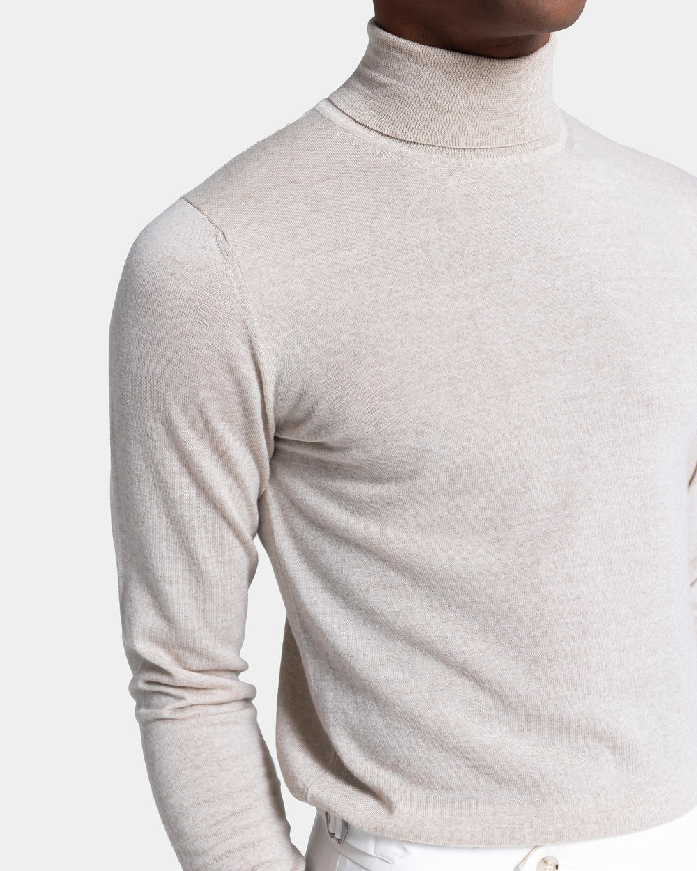 Maglia dolcevita rasata ad 1 filo extra-fine dal titolo 2/48 a maniche lunghe tinta unita sabbia, realizzata in lussuoso, brillante e morbido filato Cashwool®, 100% lana merino australiana extra-fine, la più pregiata al mondo.