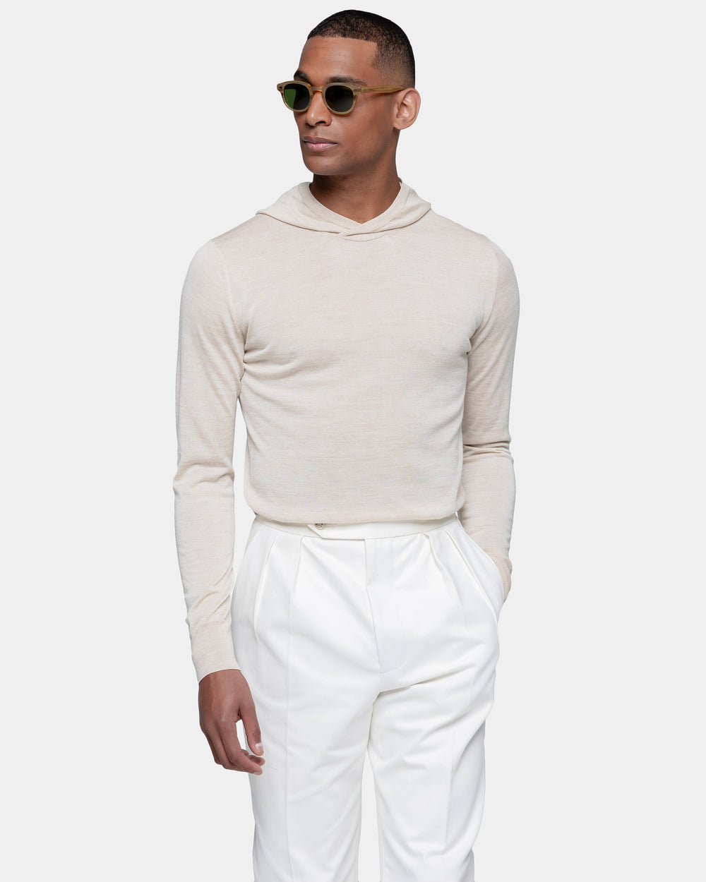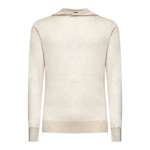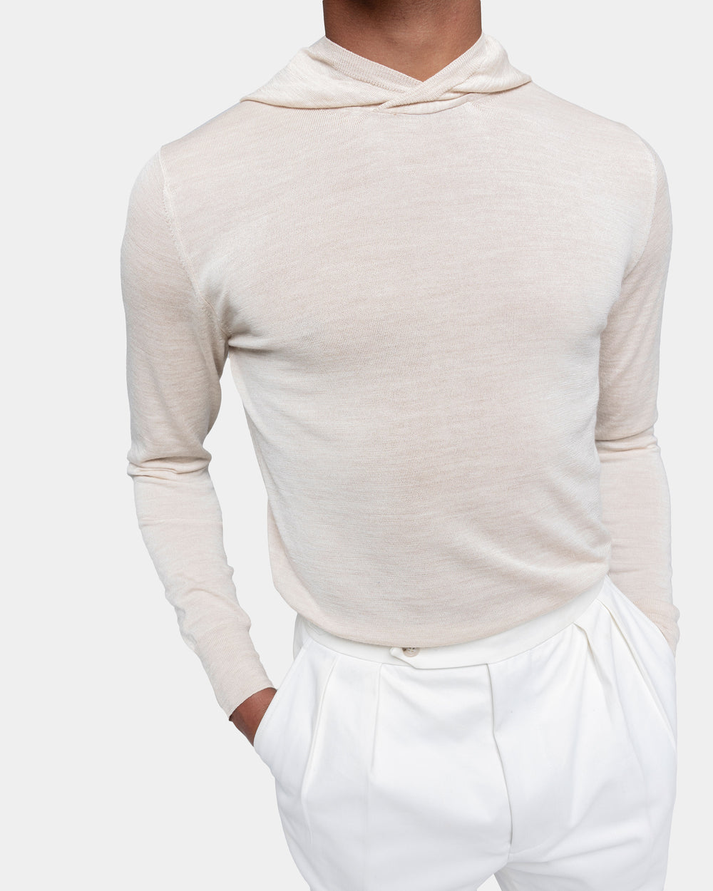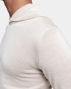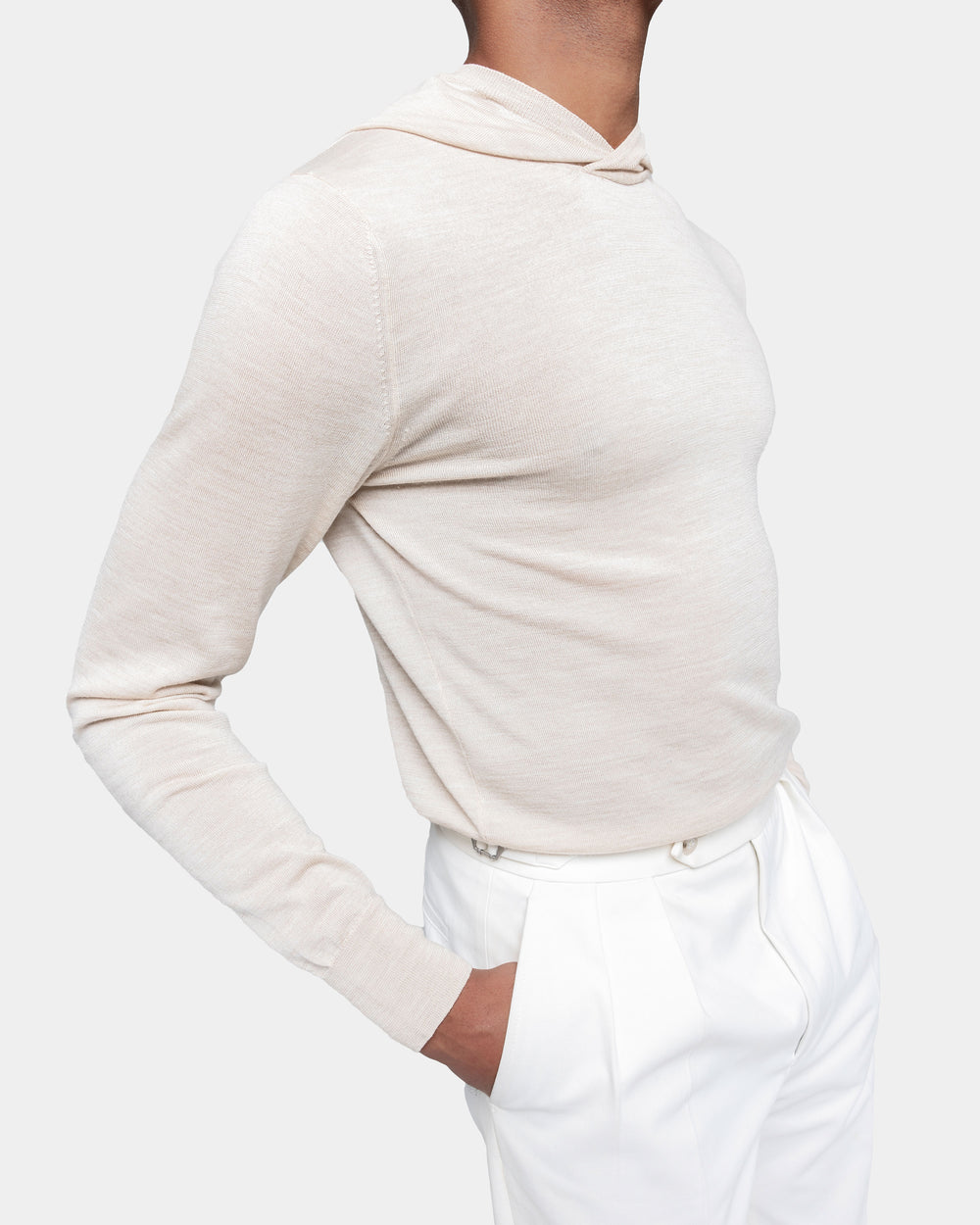 La lussuosa miscela di Lana Merino extra-fine e Seta di Filatori conferisce alla maglia un aspetto lineare in cui la mischia preziosa mette in particolare risalto la brillantezza della seta. La maglia naturale offre una sensazione di estrema morbidezza sulla pelle, trasformando un design semplice in un capo di lusso. Il colletto alto 2.2 cm dona un tocco di sartorialità aggiuntiva al capo.