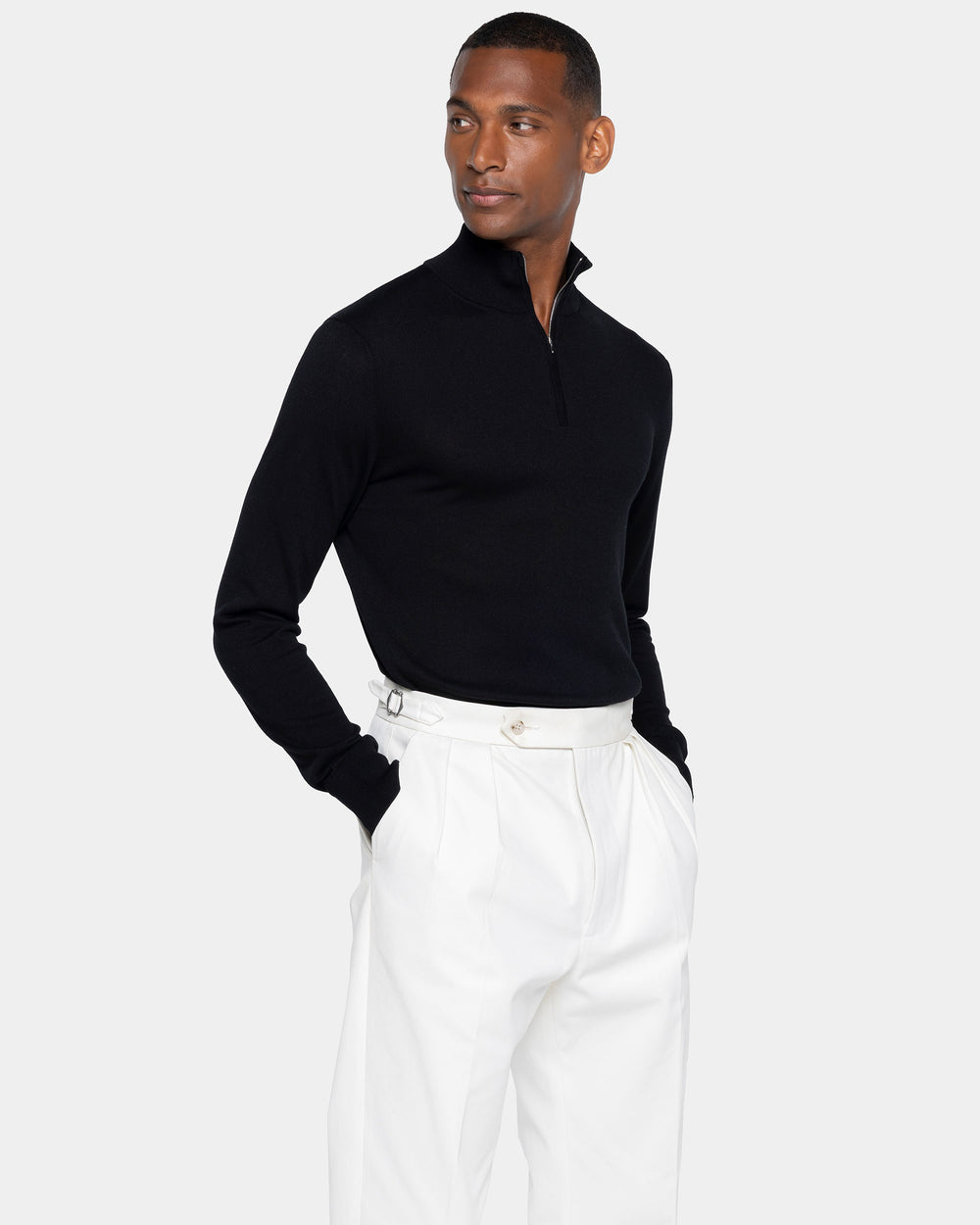 Maglia su misura rasata ad 1 filo ultra-fine dal titolo 1/30.000 manica lunga tinta unita nera modello lupetto con zip Riri da 20 cm nichel free, realizzata in una pregiata, brillante e morbida combinazione di finissimo cotone biologico e seta Mulberry, la più rara al mondo. Il colletto alto 7 cm dona un tocco di sartorialità aggiuntiva al capo.