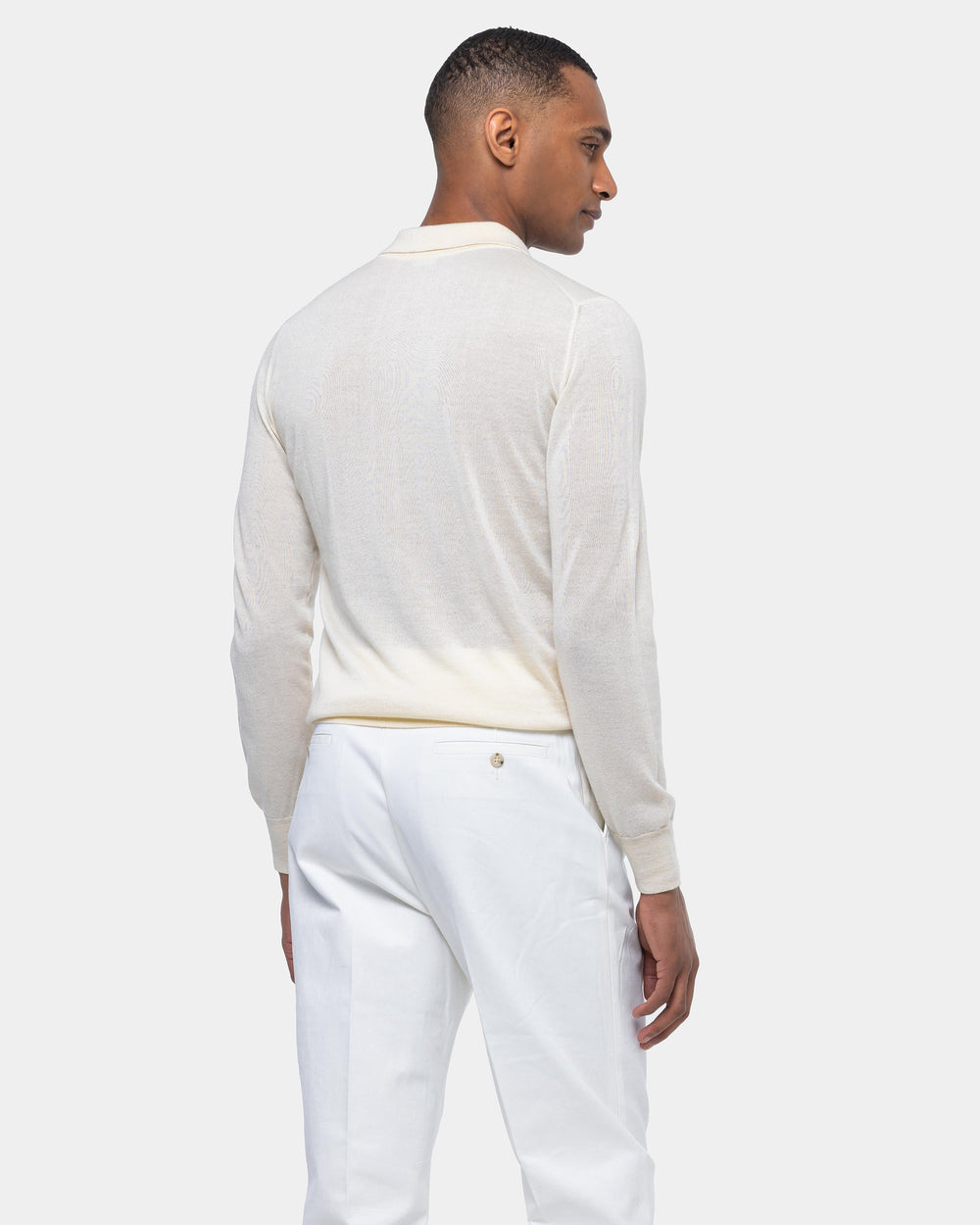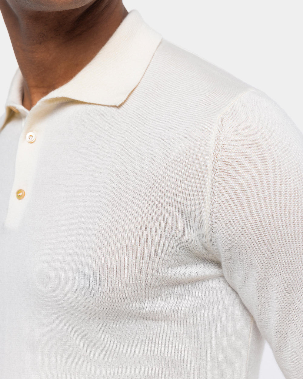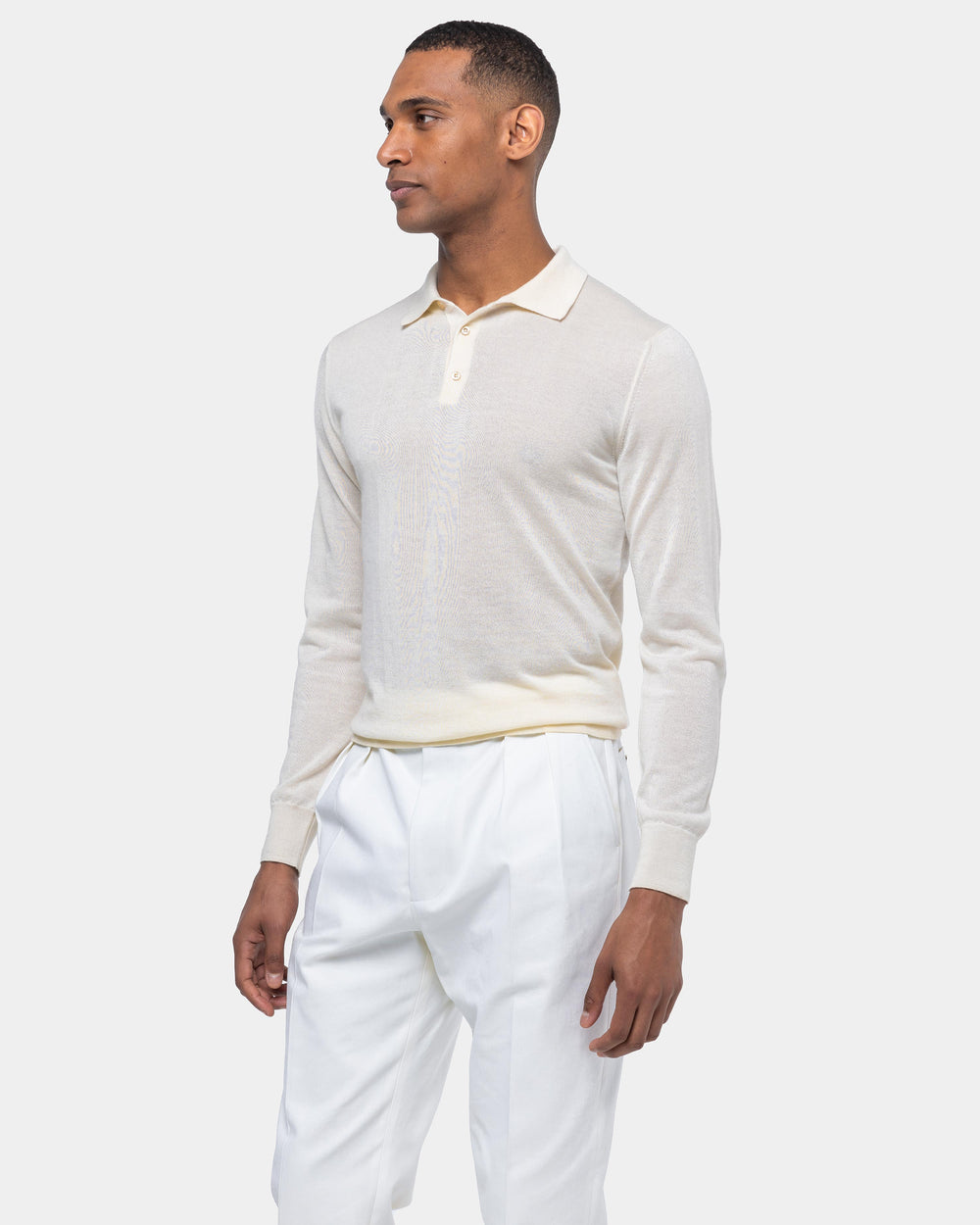 Maglia su misura rasata ad 1 filo ultra-fine dal titolo 2/48 manica lunga tinta unita bianco perla scollo polo con bottoni madre perla naturali, realizzata in una pregiata, brillante e morbida combinazione di finissimo cashmere e seta Mulberry, la più rara al mondo.
