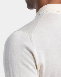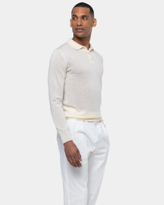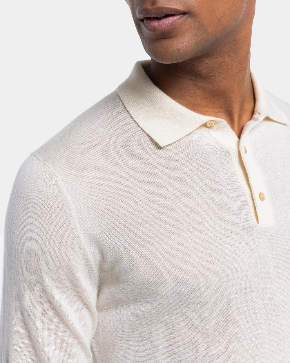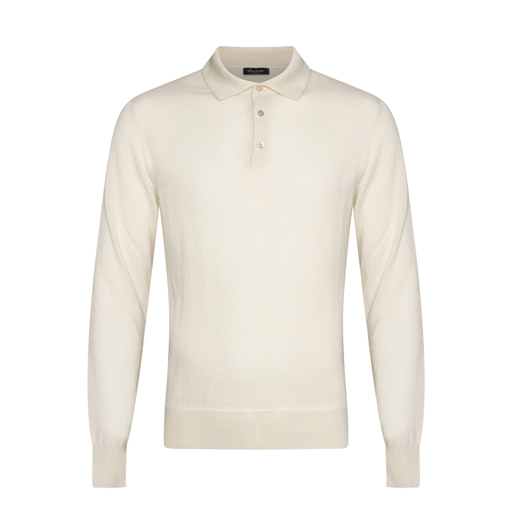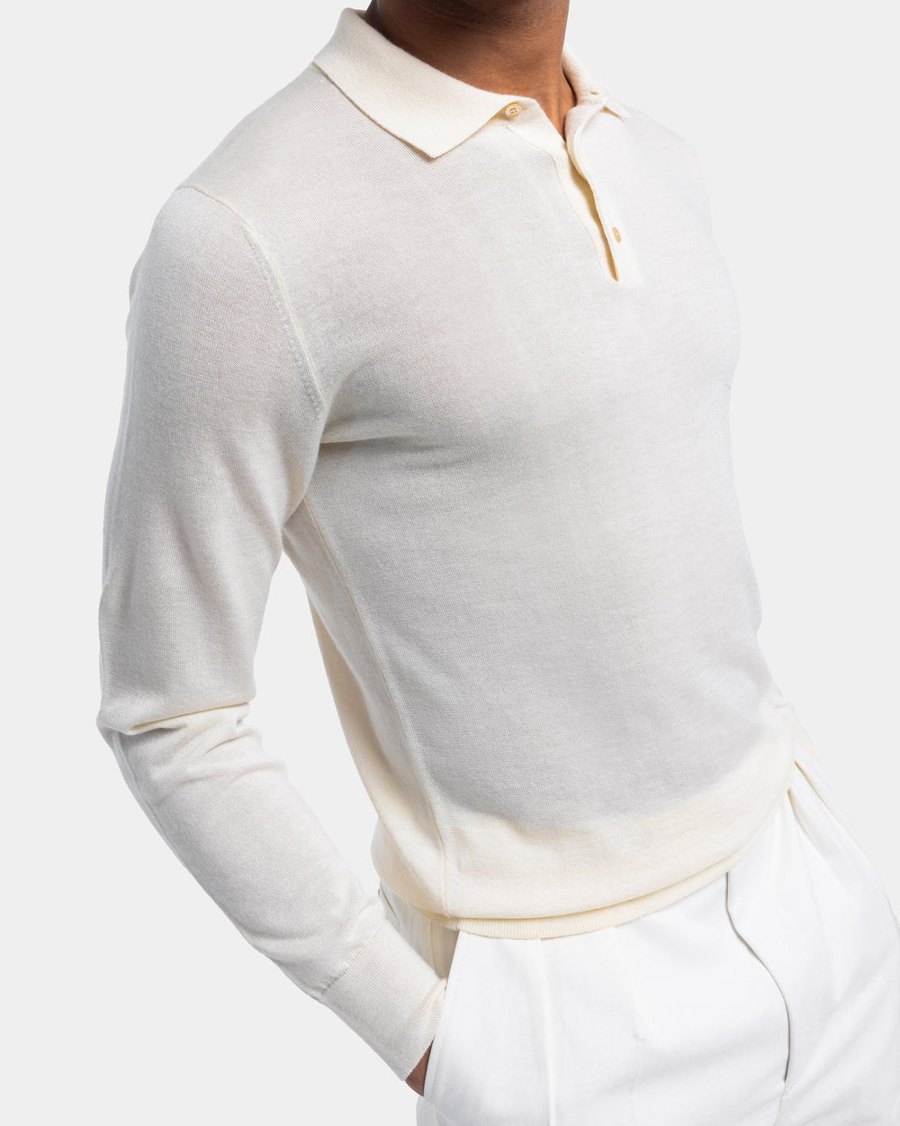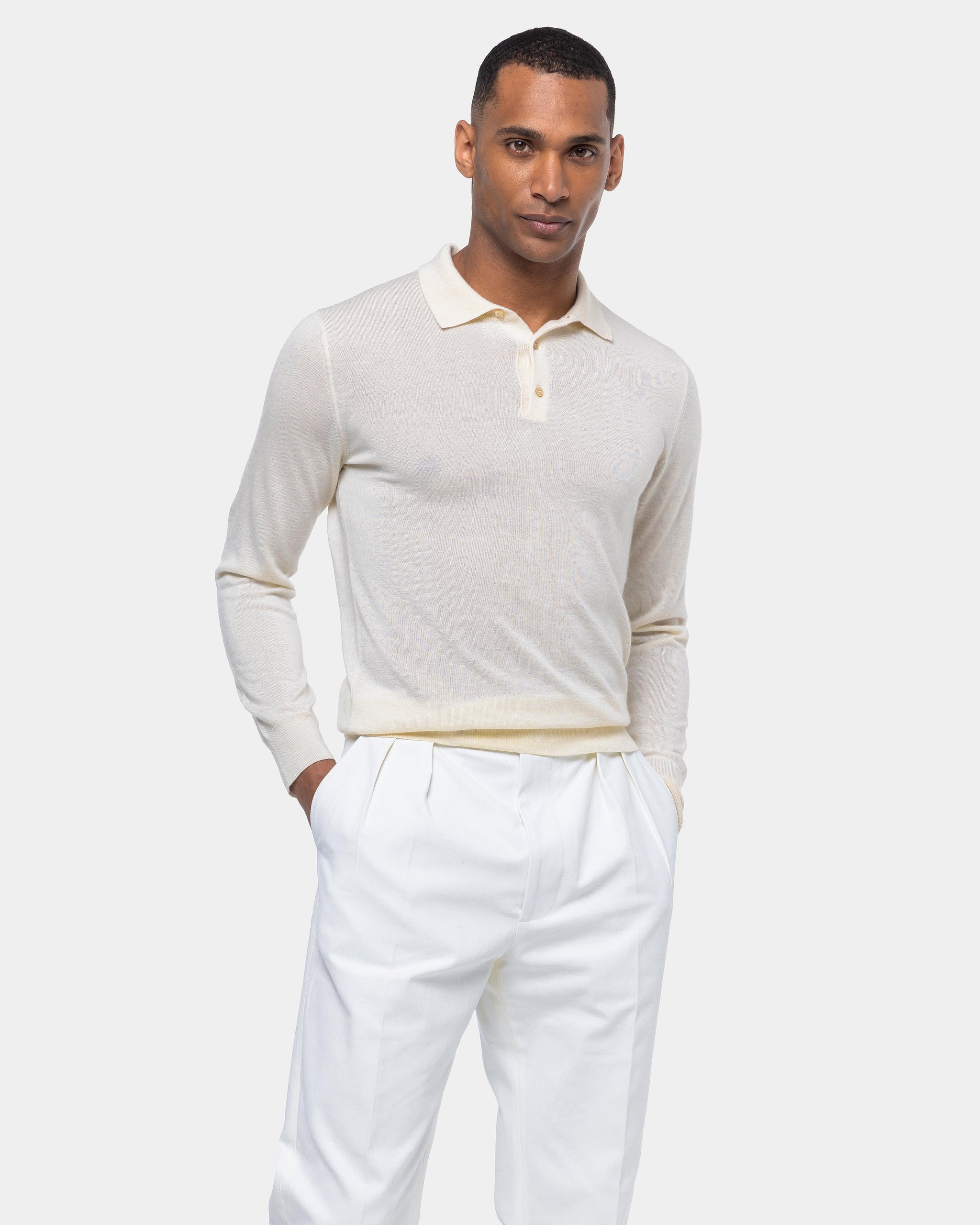 Maglia su misura rasata ad 1 filo ultra-fine dal titolo 2/48 manica lunga tinta unita bianco perla scollo polo con bottoni madre perla naturali, realizzata in una pregiata, brillante e morbida combinazione di finissimo cashmere e seta Mulberry, la più rara al mondo.