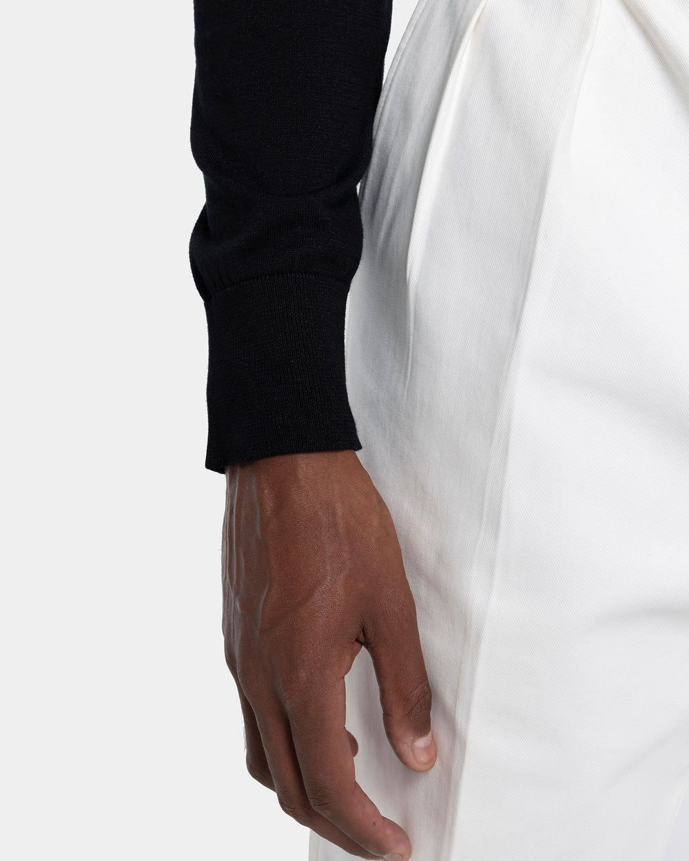 Maglia su misura rasata ad 1 filo ultra-fine dal titolo 1/30.000 a manica lunga tinta unita nera scollo polo con zip Riri da 15 cm nichel free, realizzata in una pregiata, brillante e morbida combinazione di finissimo cotone biologico e seta Mulberry, la più rara al mondo.