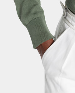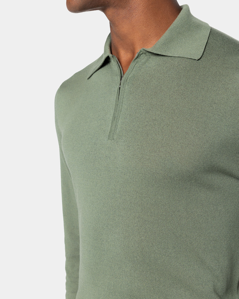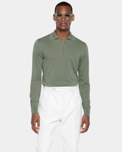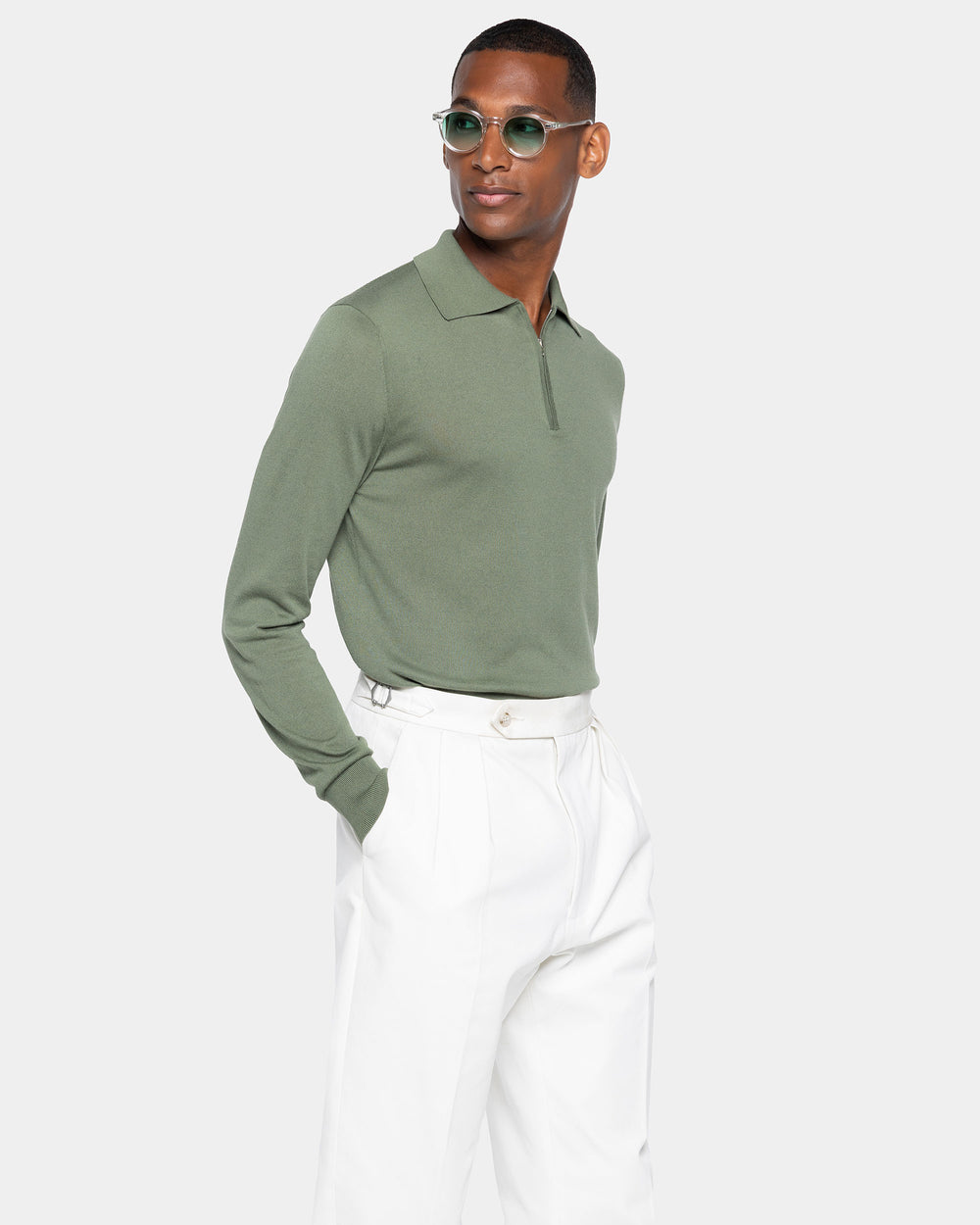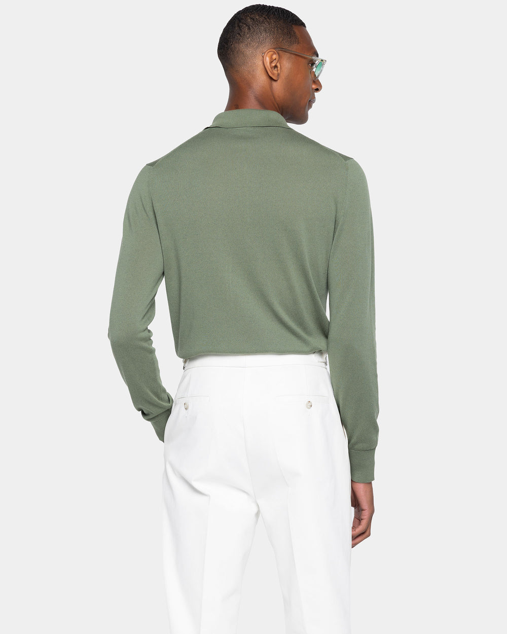 Maglia su misura rasata ad 1 filo ultra-fine dal titolo 1/30.000 a manica lunga tinta unita verde militare scollo polo con zip Riri da 15 cm nichel free, realizzata in una pregiata, brillante e morbida combinazione di finissimo cotone biologico e seta Mulberry, la più rara al mondo.