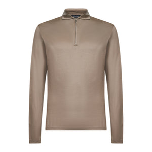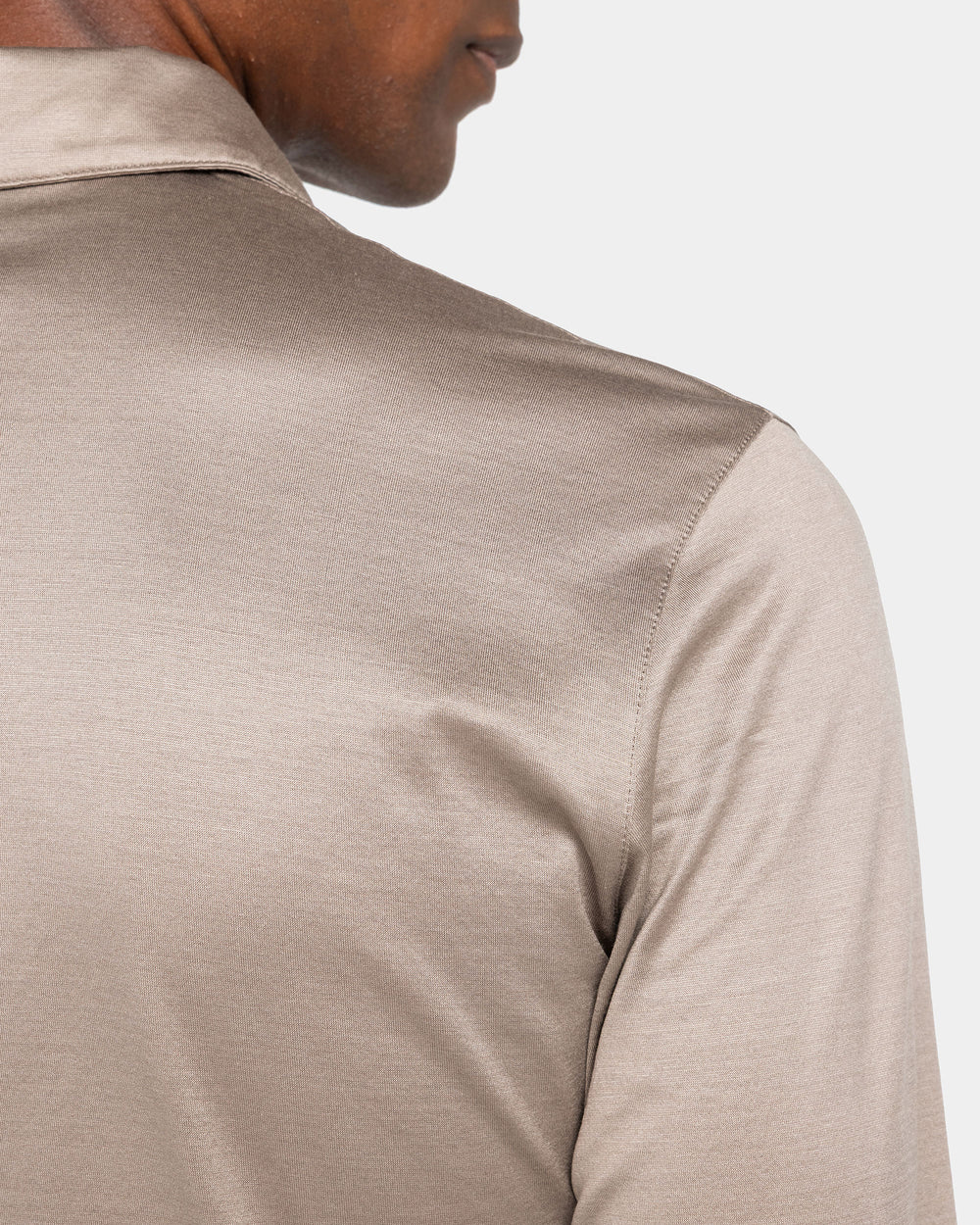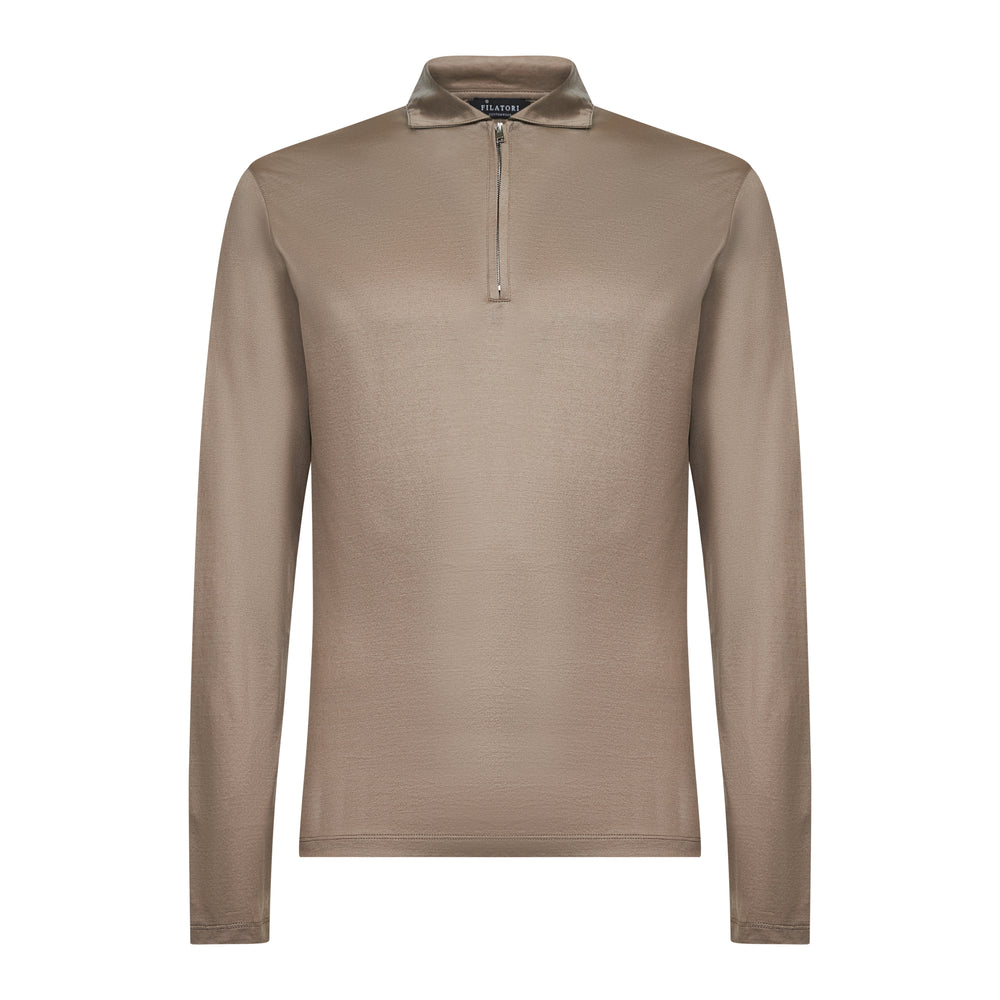 Realizzata in 100% jersey tinto filo extra-fine 80/2 cotone Filoscozia® Makò Egiziano della tessitura italiana Tessilmaglia, risulta leggero, brillante e dalla mano liscia e scorrevole, ed è un prezioso pass part out del guardaroba contemporaneo. Questo capo nasce dalla costante dedizione di Filatori alla ricerca dell’eccellenza e si distingue per l’attenzione meticolosa alle finiture e ai dettagli. Le cuciture lungo il giro-spalla conferiscono una nota di ricercatezza, mentre lo scollo alla francese, interamente impunturato, valorizza la costruzione del capo. La zip frontale da 15 cm, firmata Riri e nichel free, è rifinita internamente con una paramontura in tessuto, pensata per offrire comfort e una linea impeccabile.