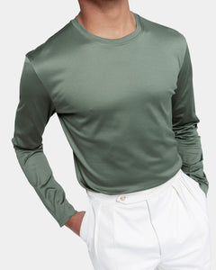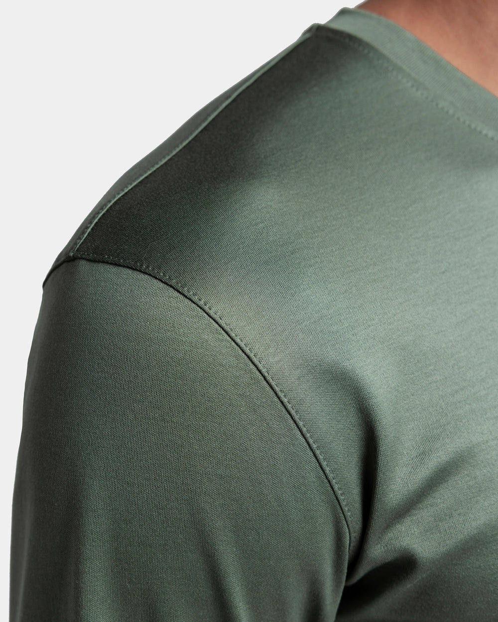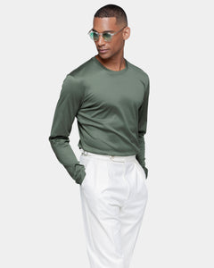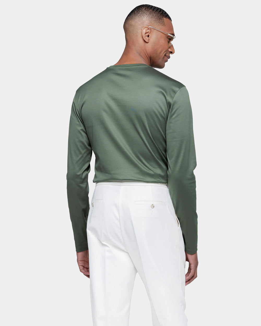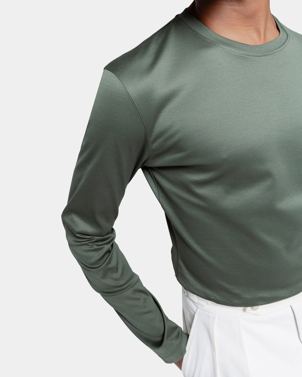 Realizzata in 100% jersey ultra-fine 120/2 cotone Supima® della tessitura italiana Tessilmaglia, dal peso di 170 g/mq, risulta corposo, brillante e dalla mano liscia e scorrevole, ed è un prezioso pass part out del guardaroba contemporaneo. Questo capo è il risultato della fedeltà Filatori per la ricerca dell'eccellenza e si caratterizza per un'elevata cura delle rifiniture e dei dettagli. Le cuciture a vista sotto lo scollo e sul giro-spalla donano un tocco di sartorialità aggiuntiva al capo. Lo scollo si presenta in una costina alta 1.8 cm in maglia a coste in filato 120/2 Supima® , dettaglio che dona un'eccezionale brillantezza al capo.